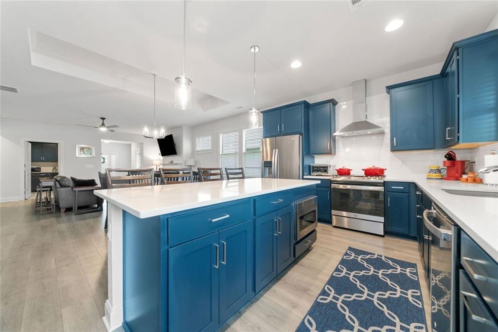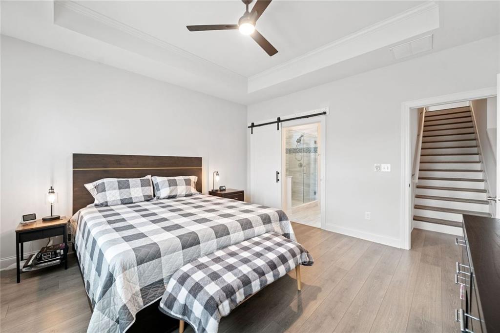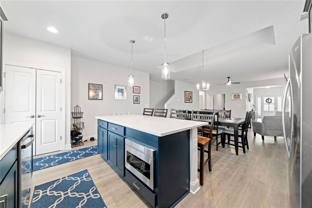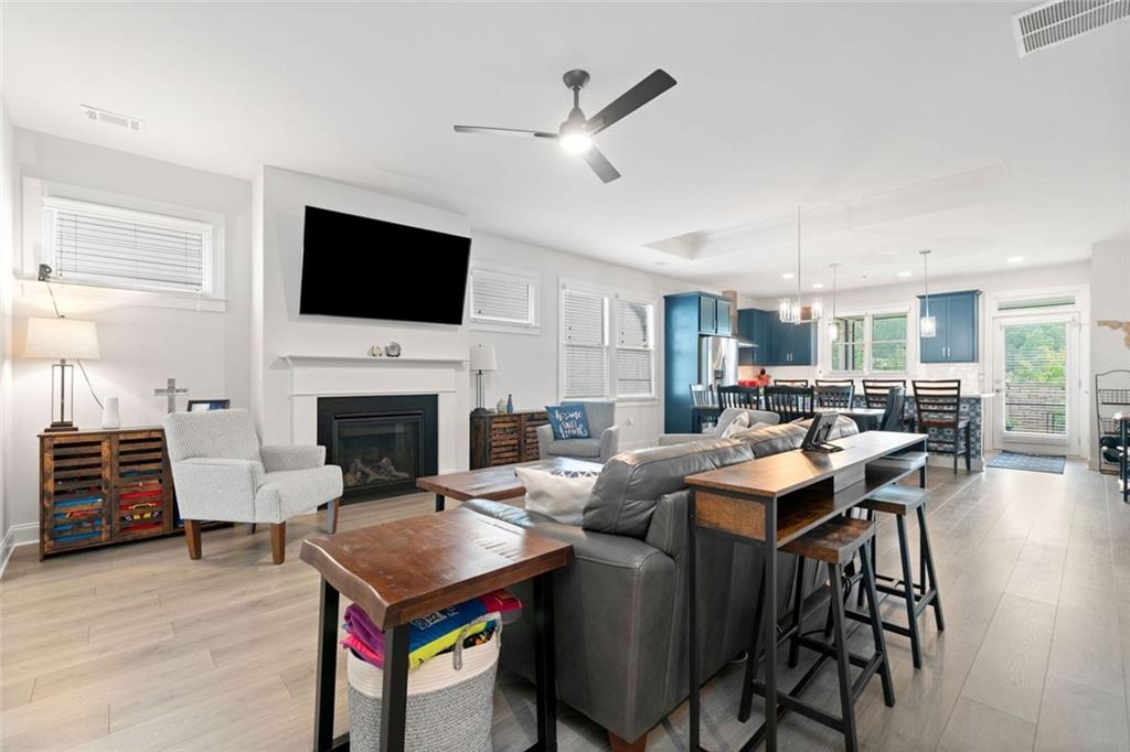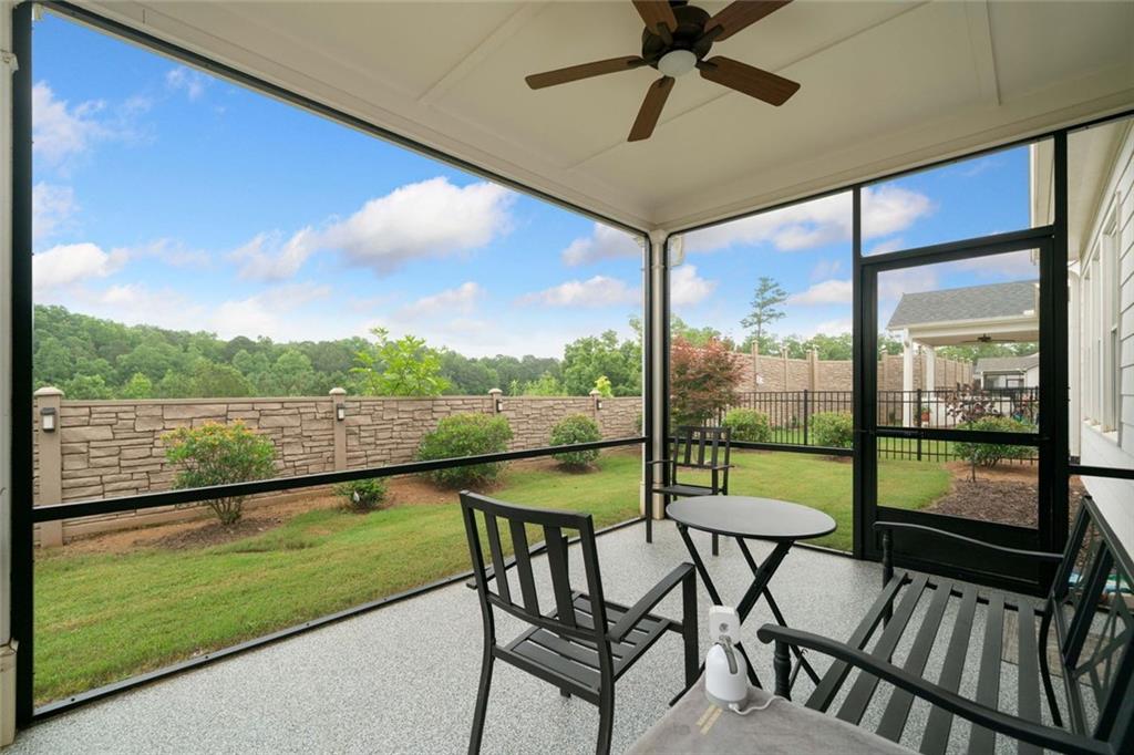 Welcome to this charming three-bedroom, three-bathroom home with a loft in a prestigious senior community. It boasts stunning views of the North Georgia mountains and many upgrades including LVP throughout home. The main level features an open living area with a cozy gas fireplace. The kitchen shines with quartz countertops, a five-burner gas range, a vent hood, and a microdrawer. Soft-close drawers and cabinet pull-outs add convenience. You'll also find two bedrooms and two bathrooms, including a spacious primary suite. The primary suite features a tiled shower with frameless glass and a double vanity with granite countertops. Upstairs, there's a roomy loft, an extra bedroom, and a full bath. The main level has a laundry room with added cabinetry for storage. Enjoy your morning coffee or evening breeze on the screened porch overlooking the fenced yard. The oversized two-car garage has epoxy flooring for a clean, durable finish. Step inside to experience the vibrant community. Explore the walking trails, play pickleball, or fish at the lake. The community also features a pool, a dog park, a garden, and a clubhouse with arts and crafts, a demonstration kitchen, and a fitness center. Unwind in the yoga room, outdoor kitchen, or gather around the firepit. The monthly HOA fee covers access to these amenities, along with lawn maintenance, trash, recycling, internet, and cable. Enjoy a lifestyle of ease at Grandview at Gateway.