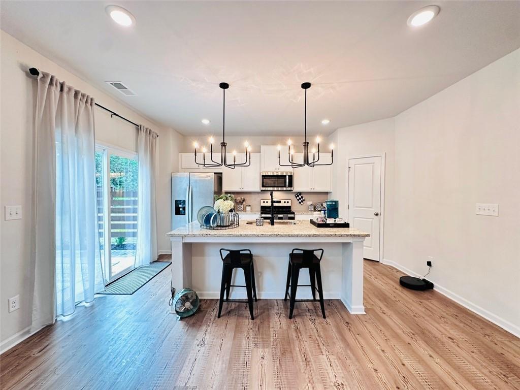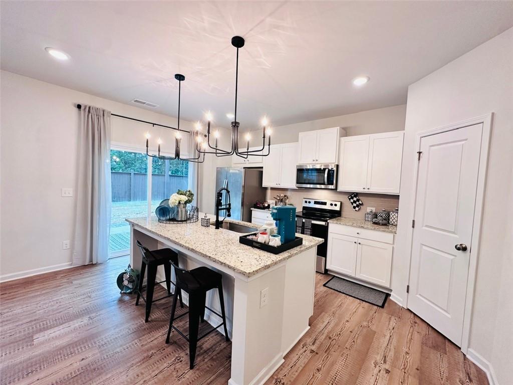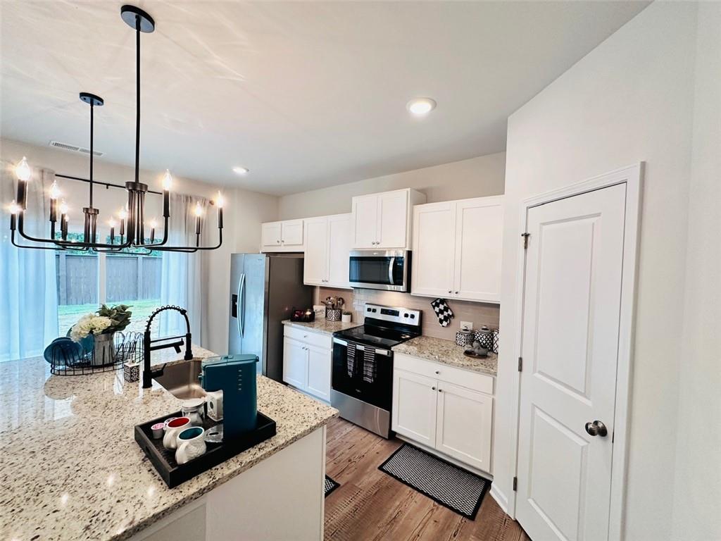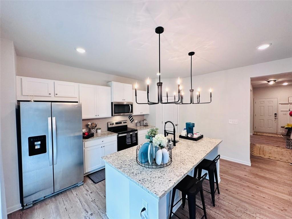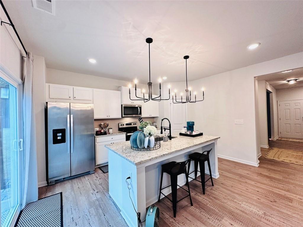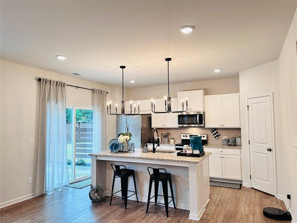 - KitchenBreakfast Room, Cabinets White, Eat-in Kitchen, Kitchen Island, Pantry Walk-In, Stone Counters, View to Family Room
