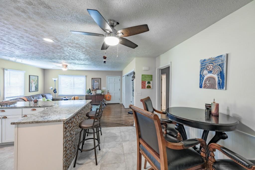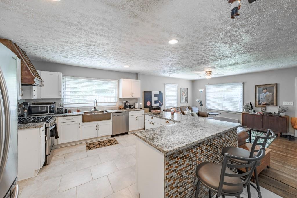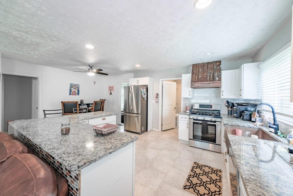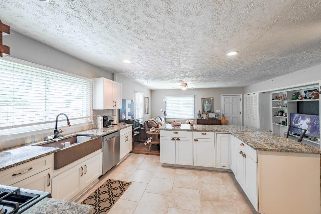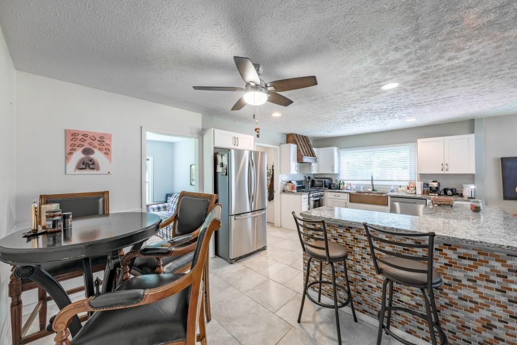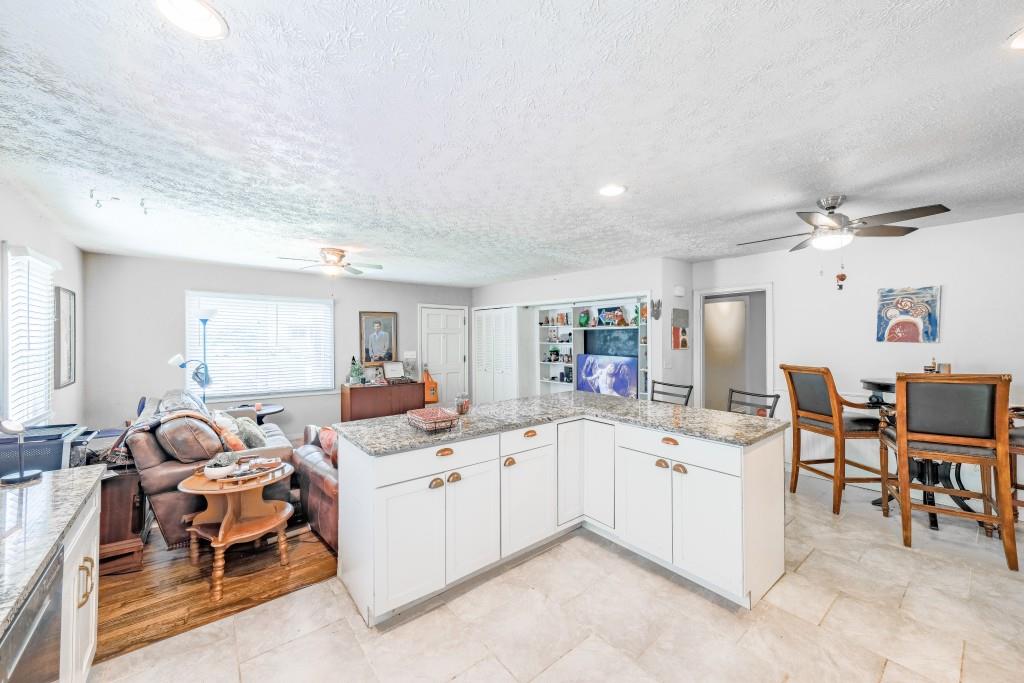 - KitchenBreakfast Bar, Cabinets White, Eat-in Kitchen, Kitchen Island, Stone Counters, View to Family Room