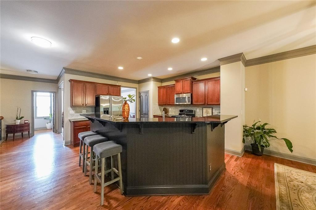- KitchenBreakfast Bar, Cabinets Stain, Eat-in Kitchen, Pantry Walk-In, Stone Counters, View to Family Room