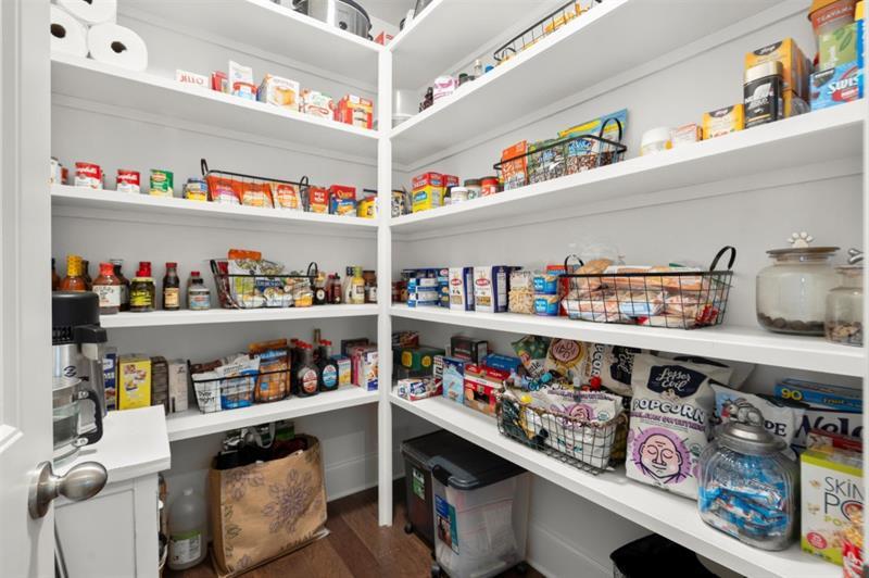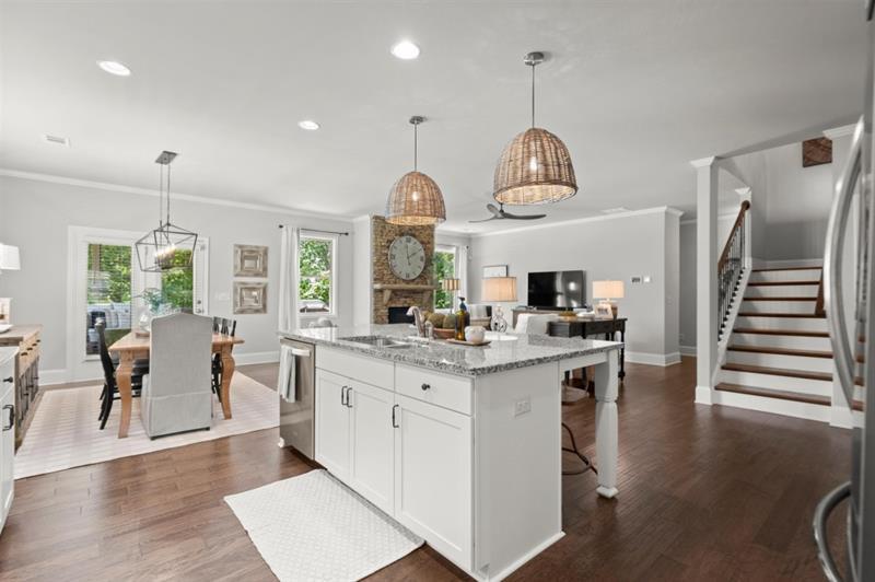 - KitchenCabinets White, Eat-in Kitchen, Kitchen Island, Pantry Walk-In, Stone Counters, View to Family Room