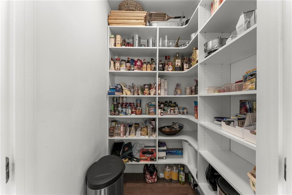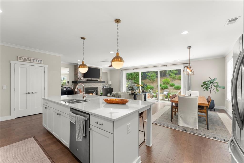 - KitchenCabinets White, Kitchen Island, Pantry, Stone Counters, View to Family Room