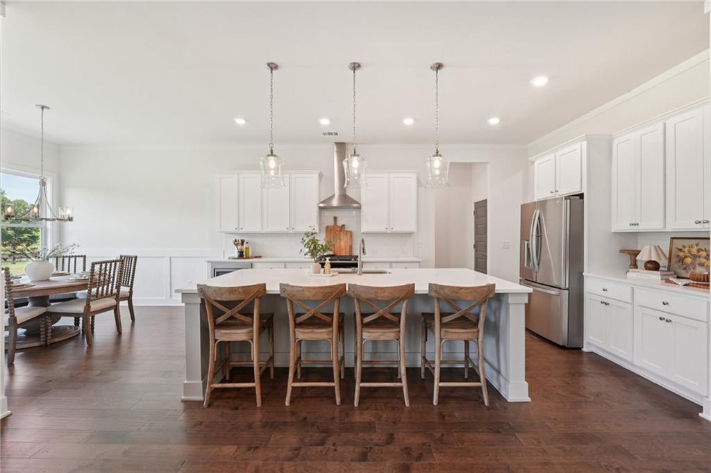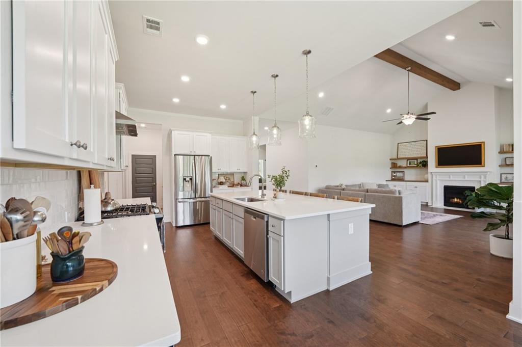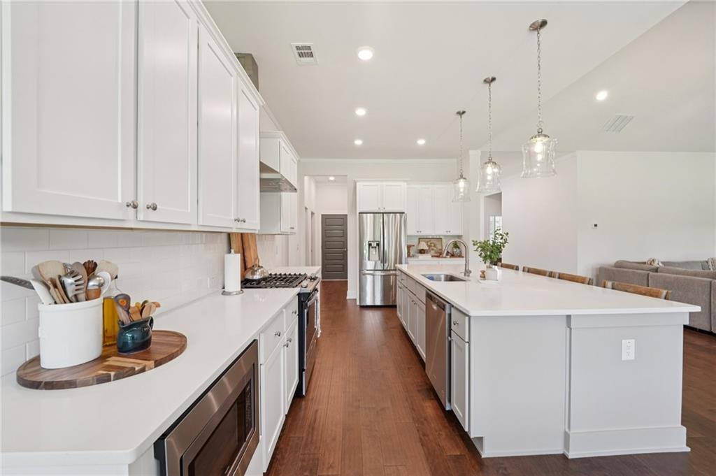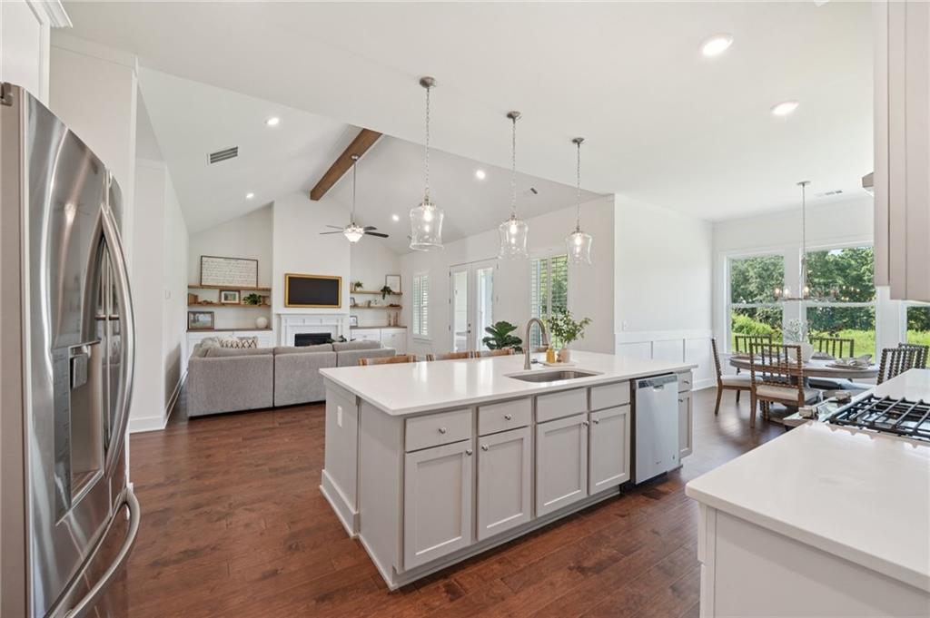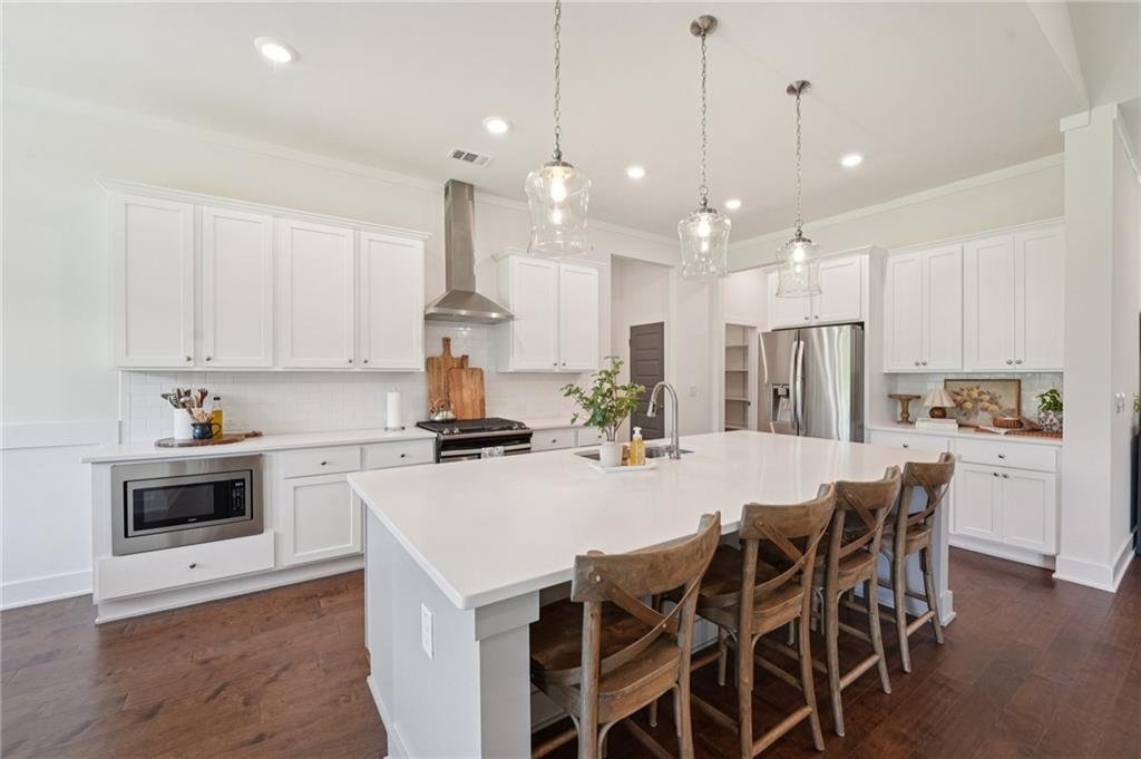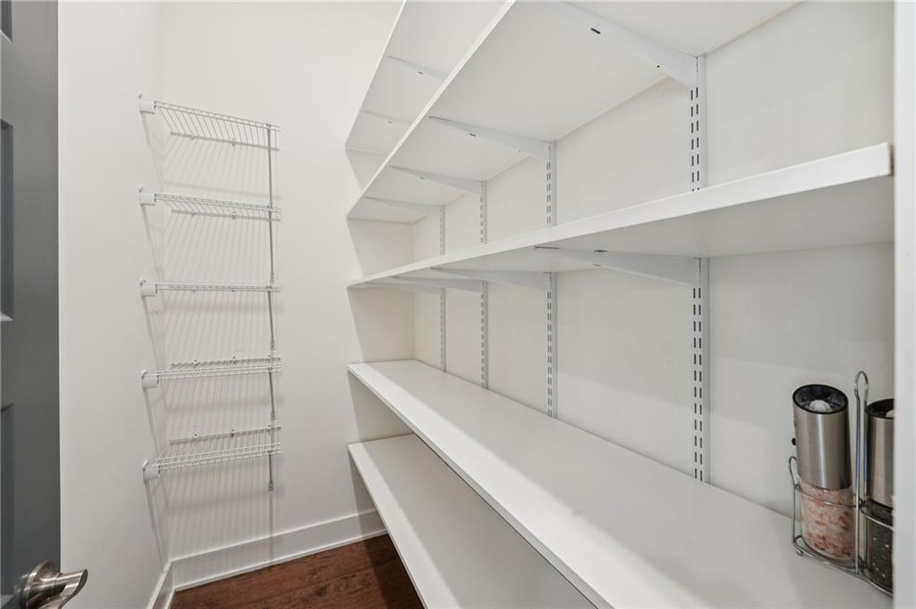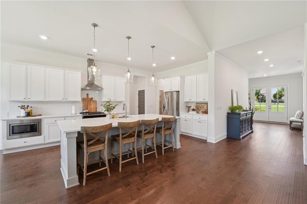 - KitchenCabinets White, Kitchen Island, Pantry Walk-In, Solid Surface Counters, View to Family Room