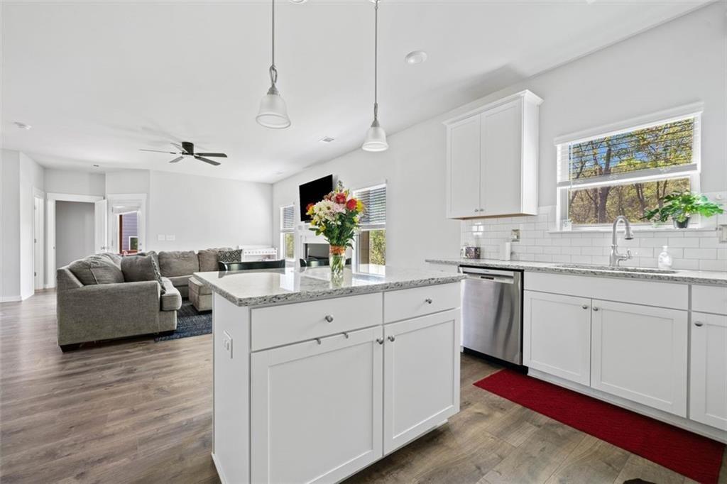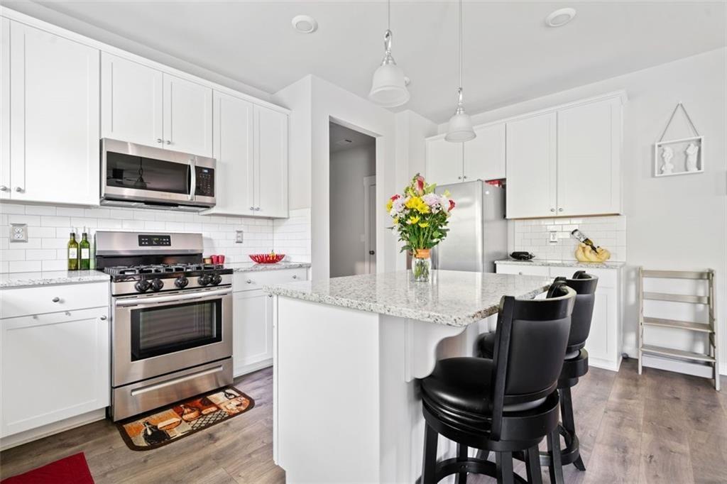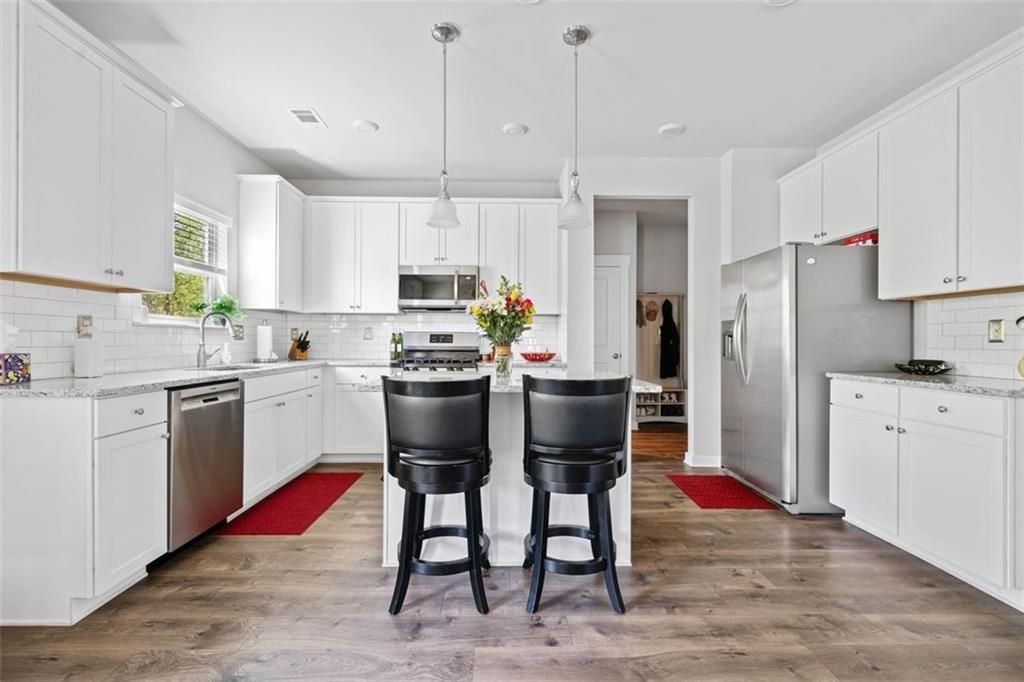 - KitchenCabinets White, Stone Counters, Eat-in Kitchen, Kitchen Island, Pantry Walk-In
