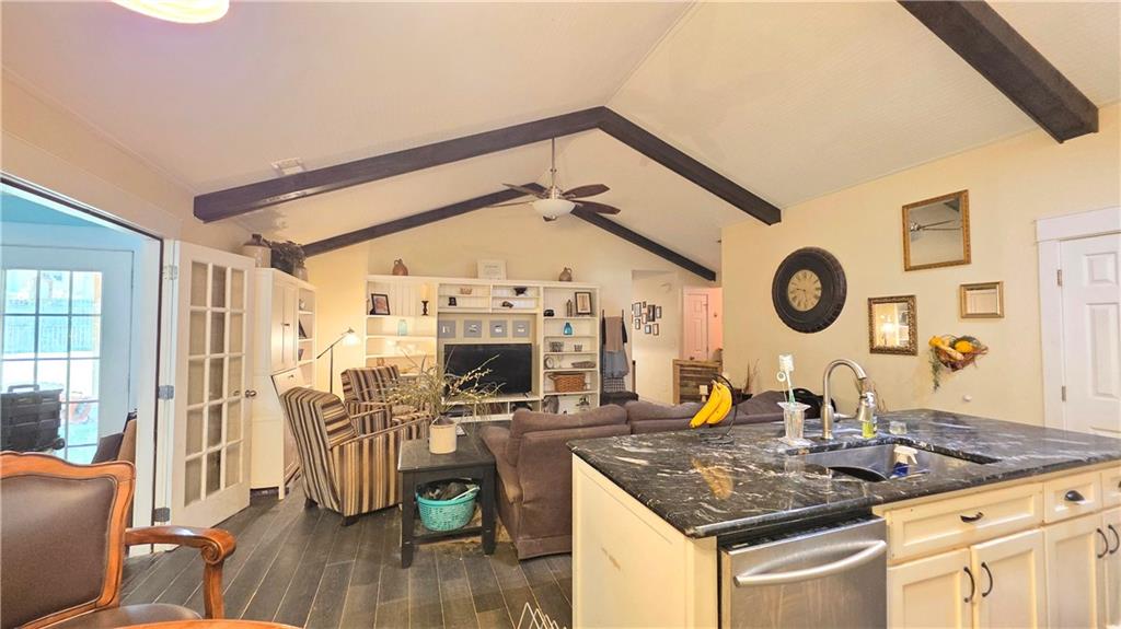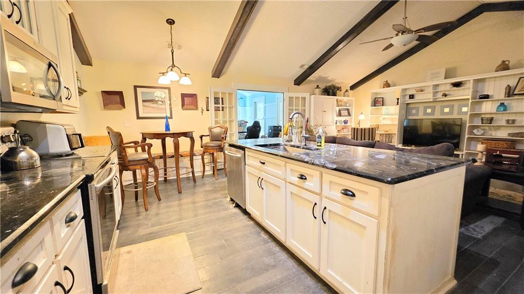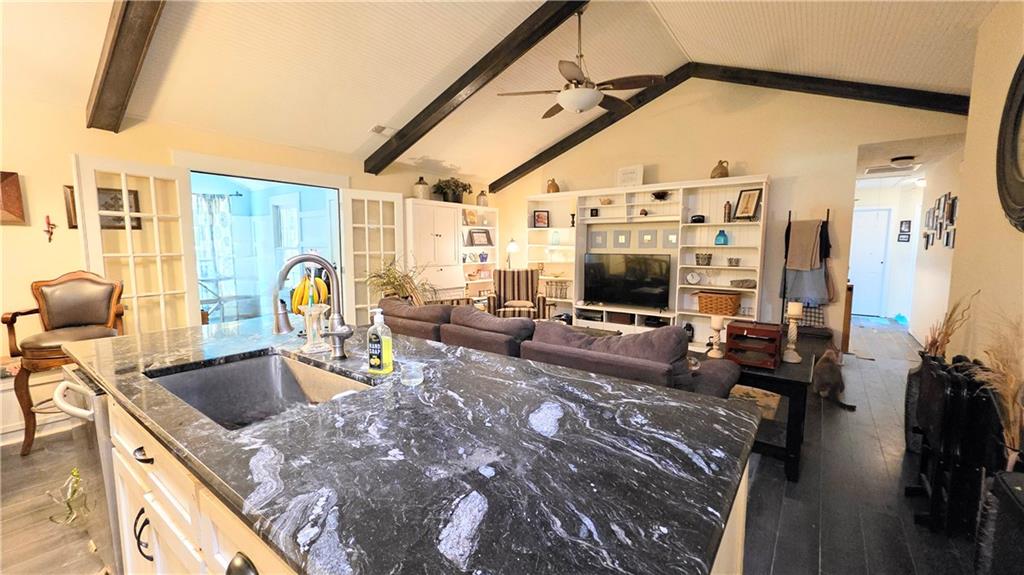 - KitchenBreakfast Bar, Cabinets White, Stone Counters, Eat-in Kitchen, Pantry, View to Family Room