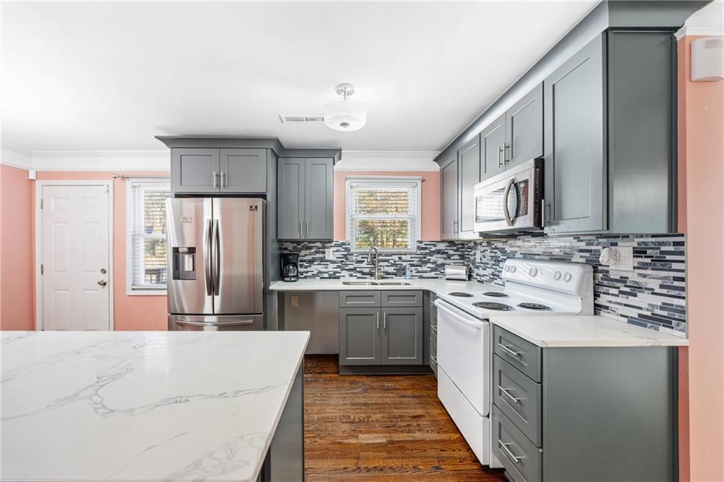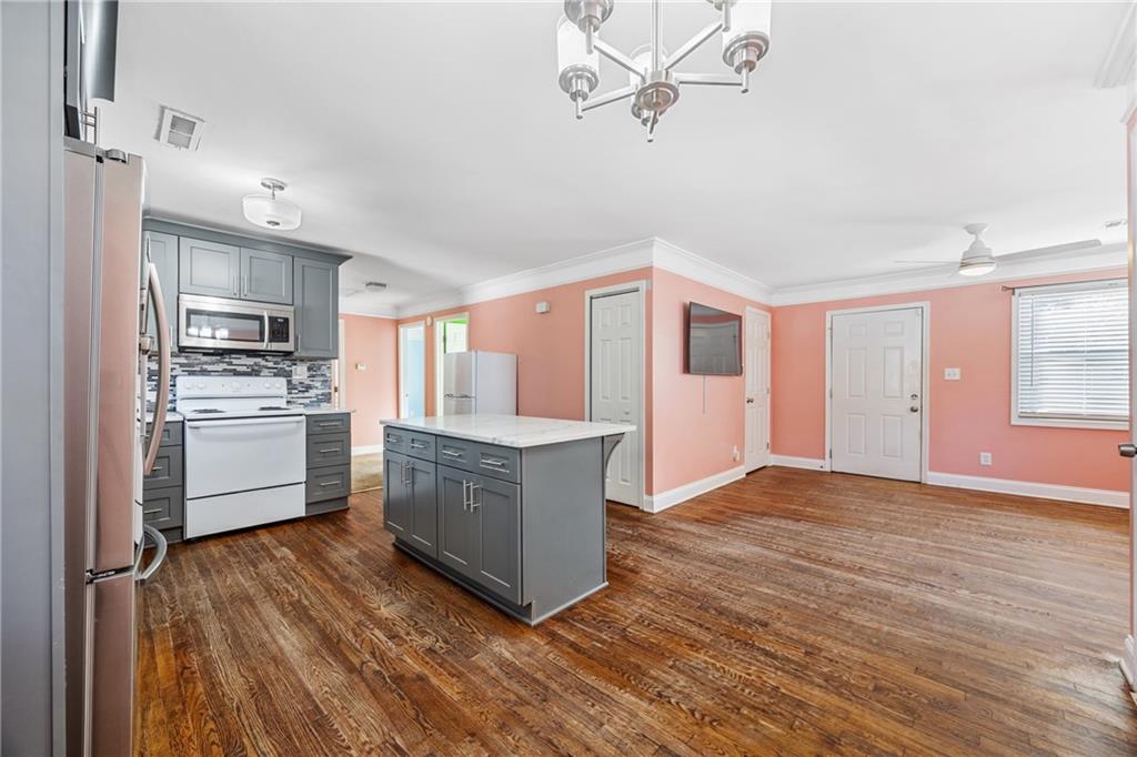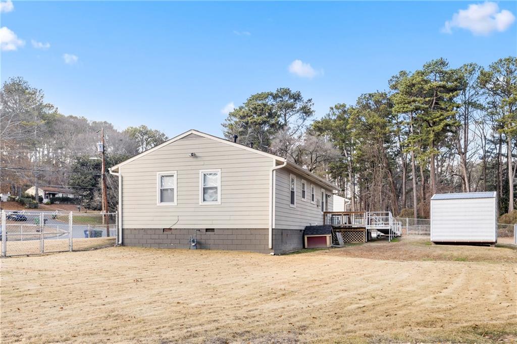This completely renovated 3 bedroom, 1 bath home offers an open floor plan creating a bright, airy living space, that seamlessly connects the living, dining, and kitchen areas. Beautiful hardwood floors flow through the main living areas. The plush carpet provides comfort in the bedrooms, and it can also be easily removed to display the hardwood floors underneath. The inviting front porch, complete with a retractable awning, offers the perfect place to unwind and enjoy the outdoors. At the back of the home, a spacious rear deck provides an excellent spot for entertaining or relaxing, overlooking the expansive backyard. Situated on a desirable corner lot, this home boasts a huge backyard with plenty of room for play, gardening, or future expansions. A convenient storage shed adds extra space for tools and equipment. With every detail carefully considered in the renovation, this home offers a perfect blend of style, comfort, and functionality.
