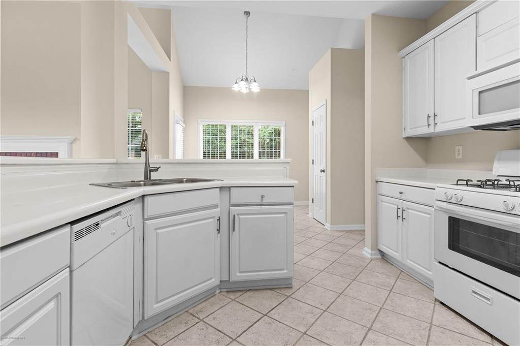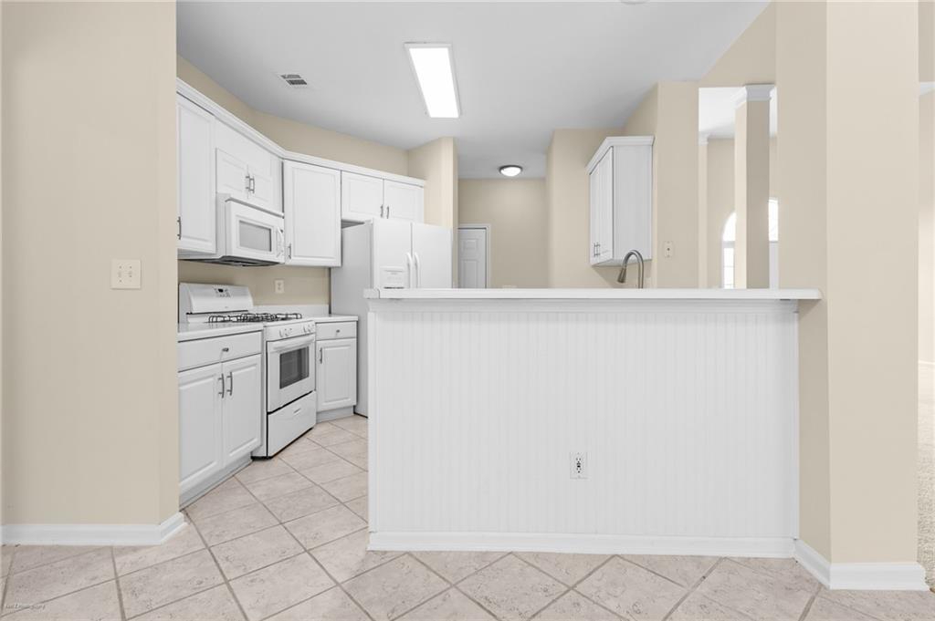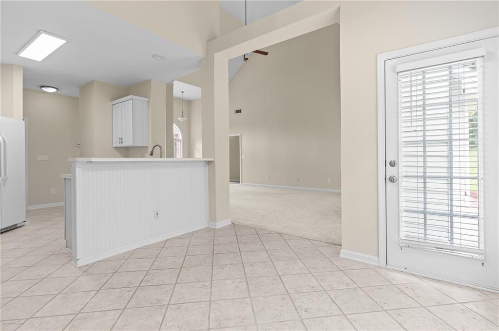 - KitchenBreakfast Bar, Breakfast Room, Cabinets White, Eat-in Kitchen, Laminate Counters, Pantry, View to Family Room