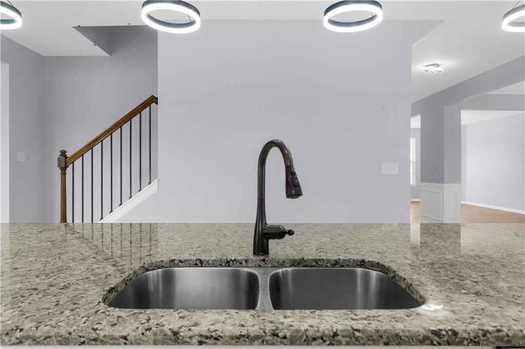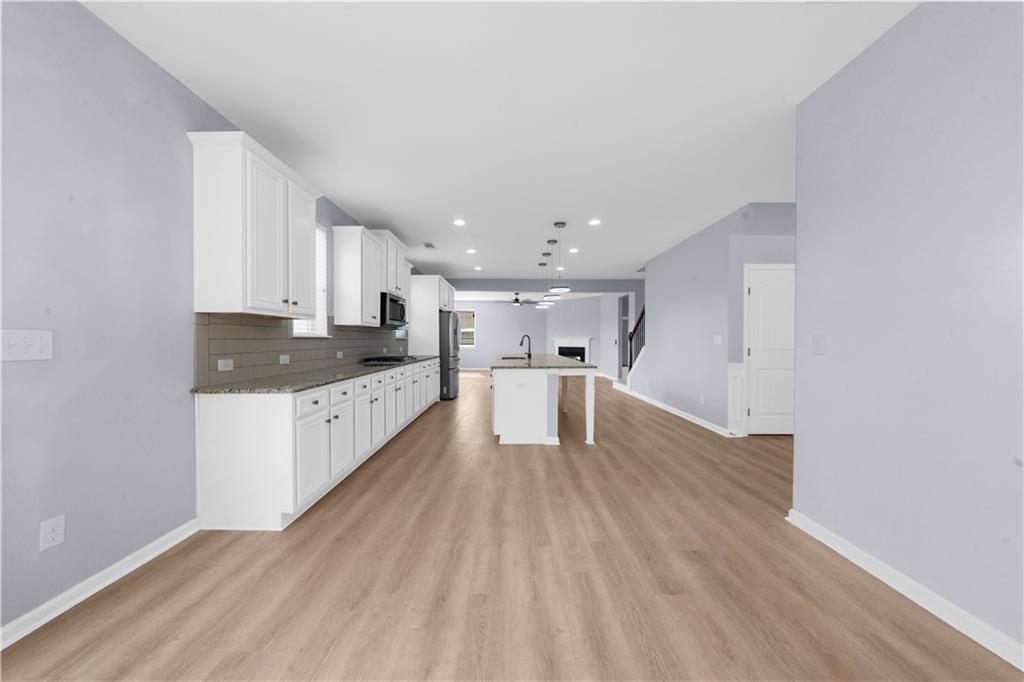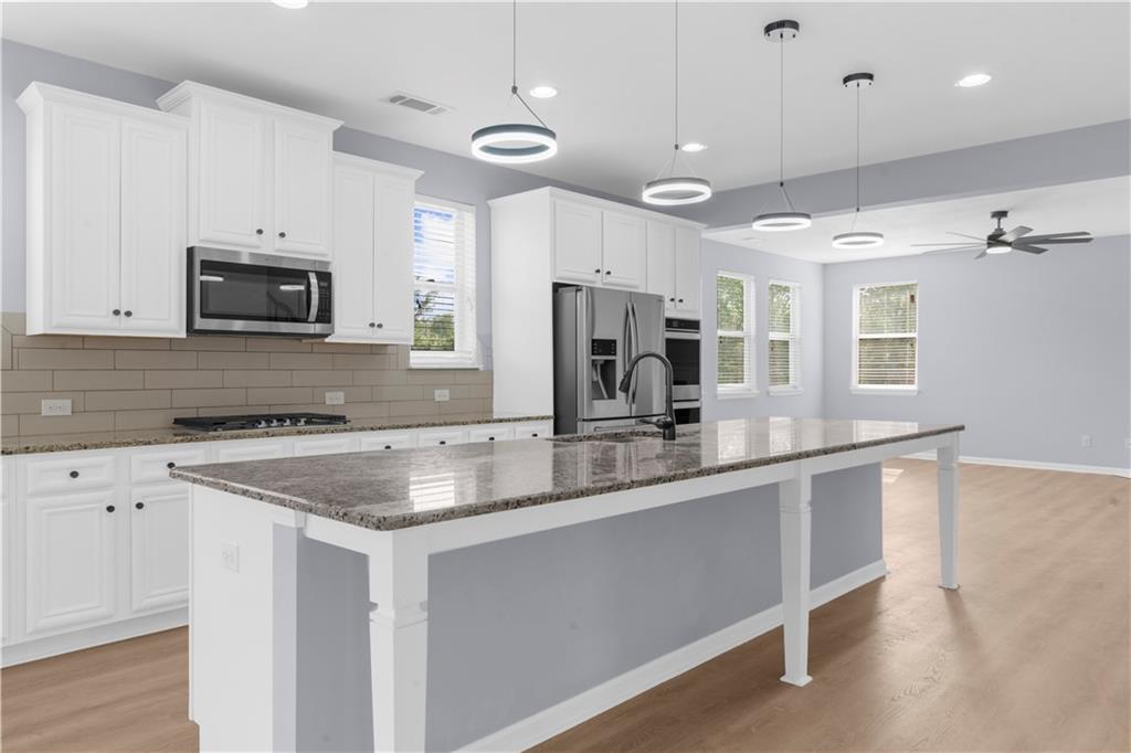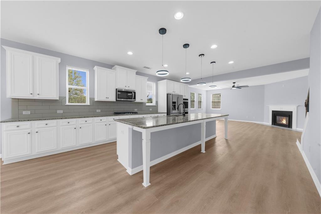 - KitchenBreakfast Bar, Breakfast Room, Cabinets White, Eat-in Kitchen, Pantry Walk-In, Stone Counters, View to Family Room