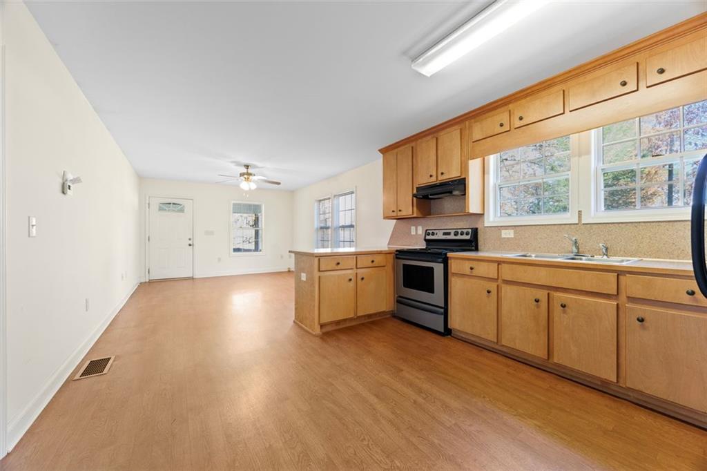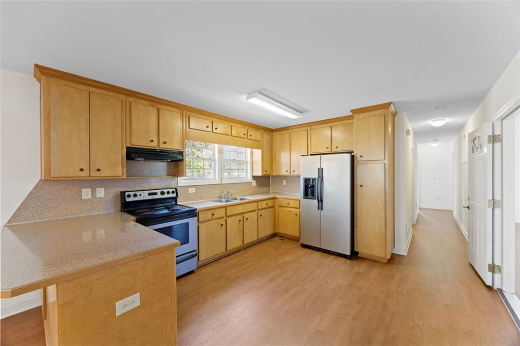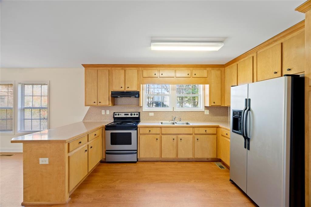 - KitchenLaminate Counters, Cabinets Stain, View to Family Room