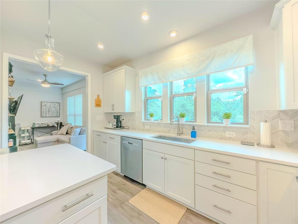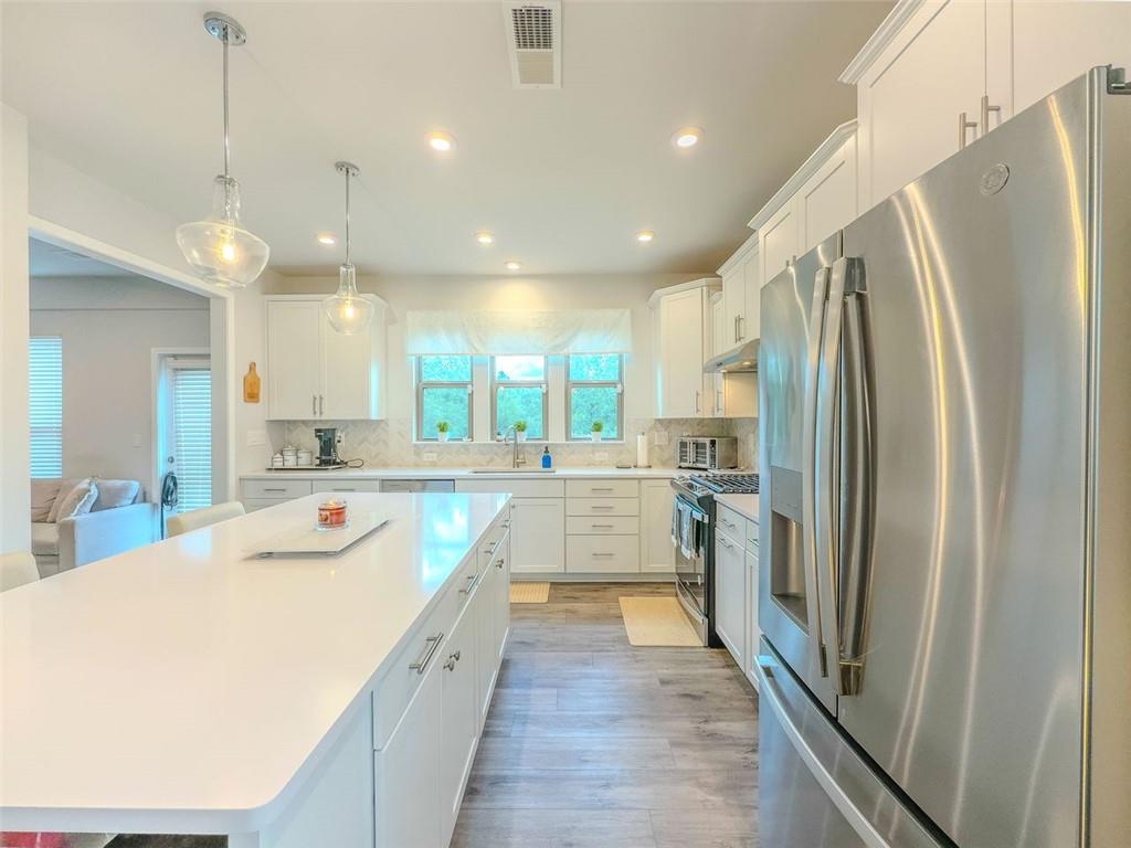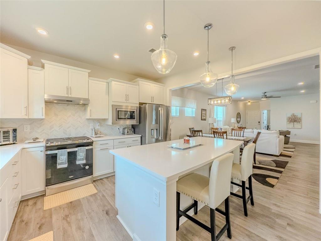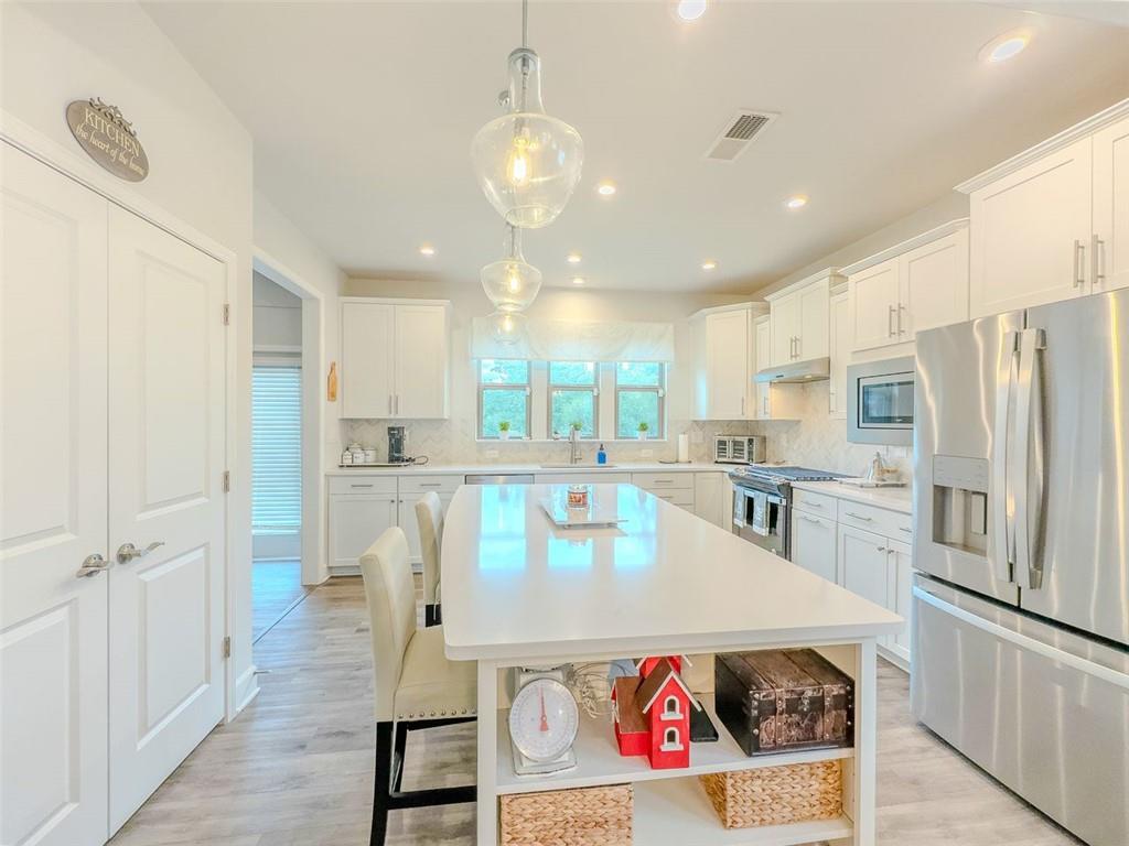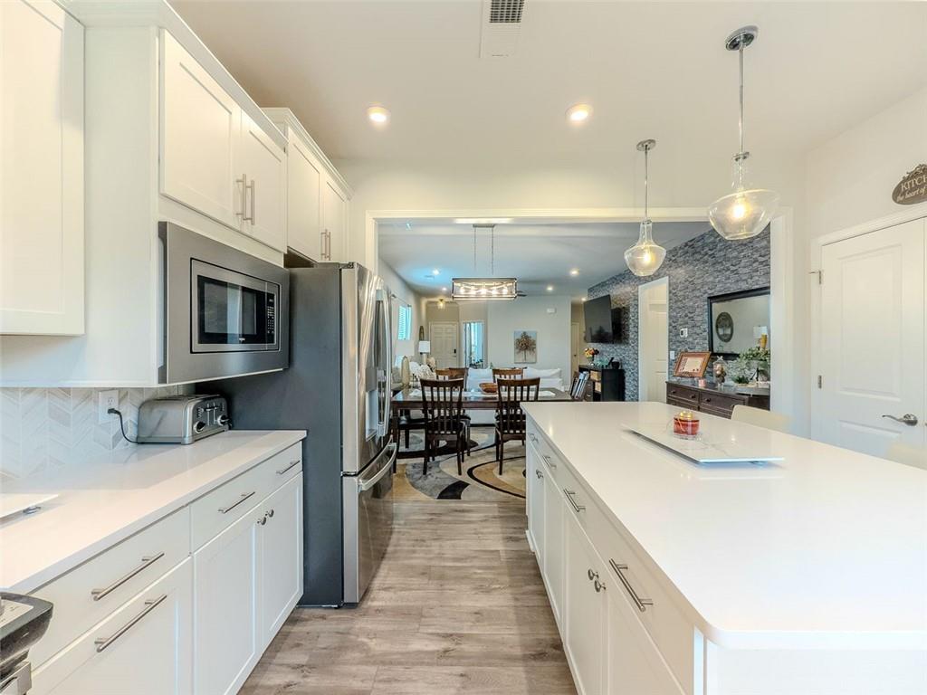 - KitchenCabinets White, Stone Counters, Kitchen Island, Pantry, View to Family Room