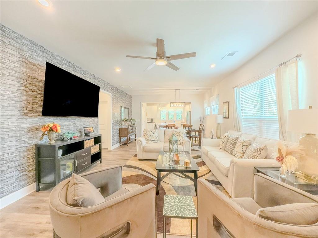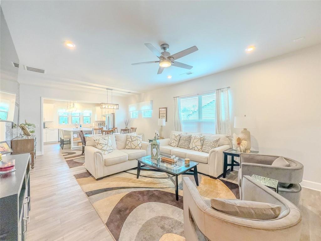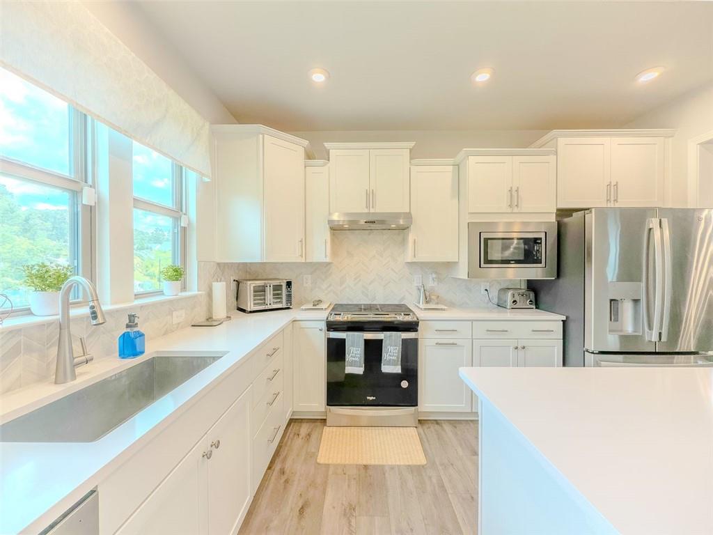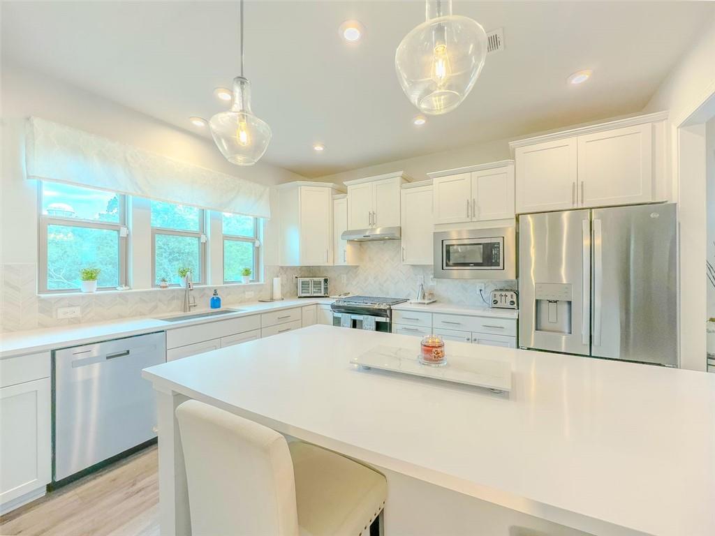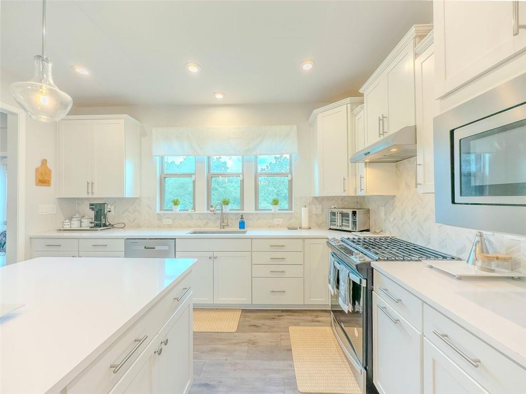 - KitchenCabinets White, Stone Counters, Kitchen Island, Pantry, View to Family Room