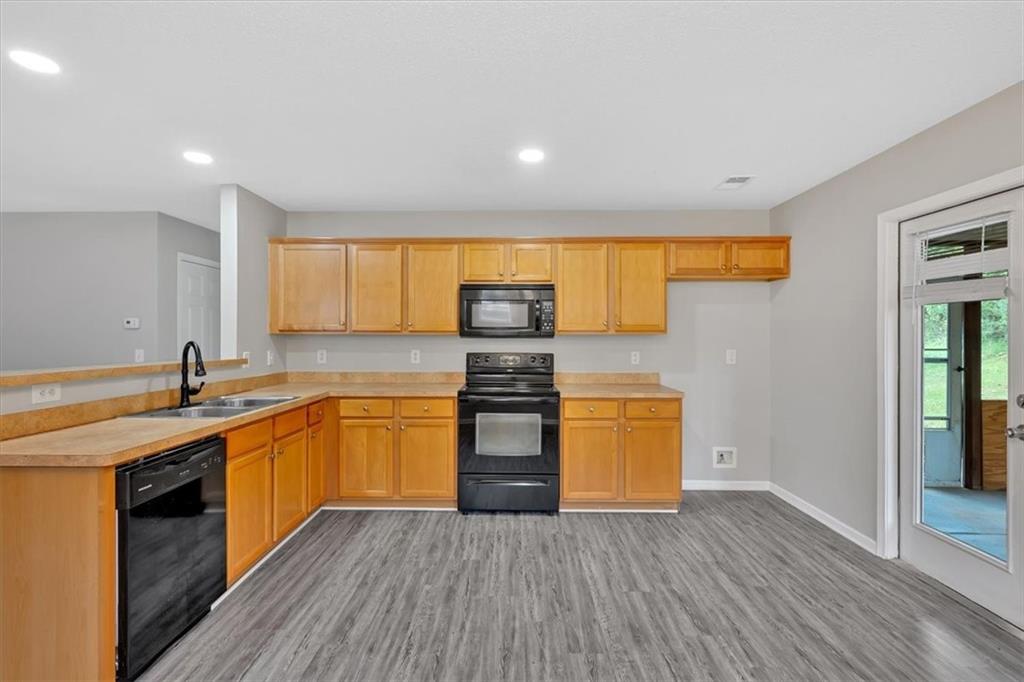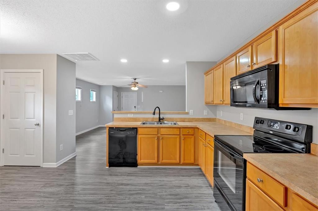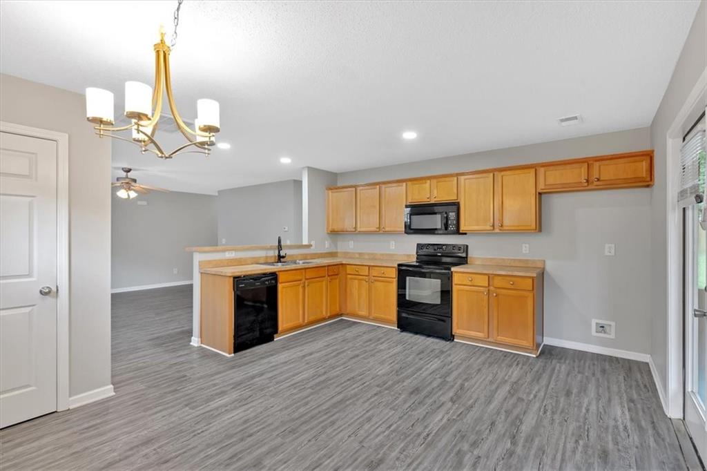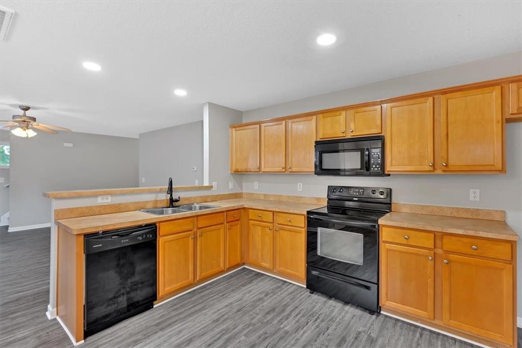 - KitchenBreakfast Bar, Breakfast Room, Cabinets Stain, Eat-in Kitchen, Laminate Counters, Pantry, Pantry Walk-In, View to Family Room