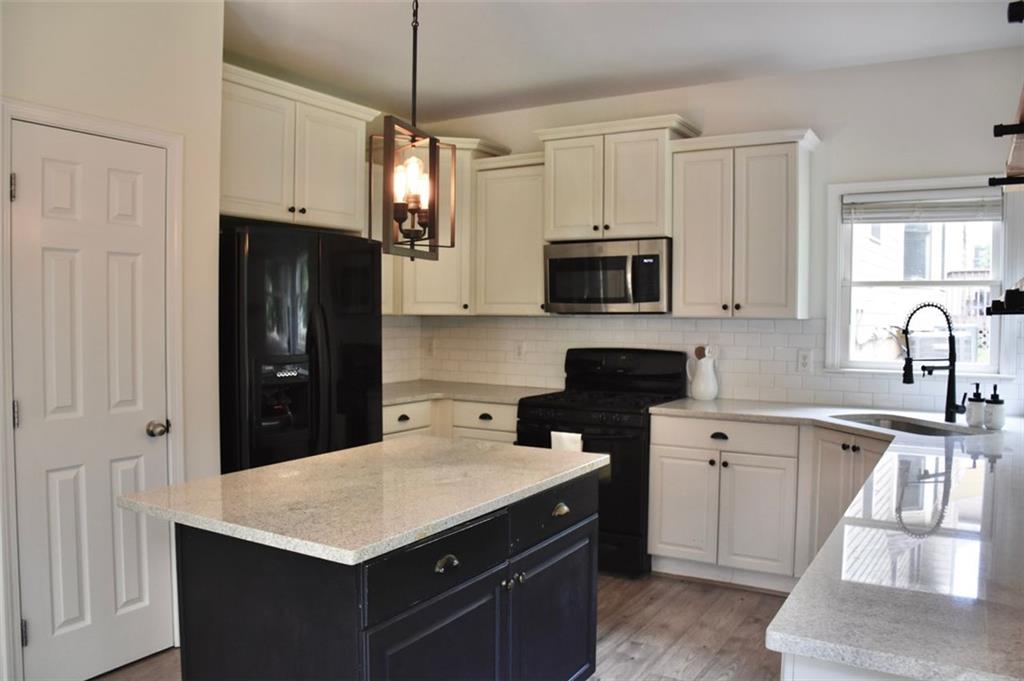 - KitchenBreakfast Bar, Cabinets White, Stone Counters, Kitchen Island, Breakfast Room