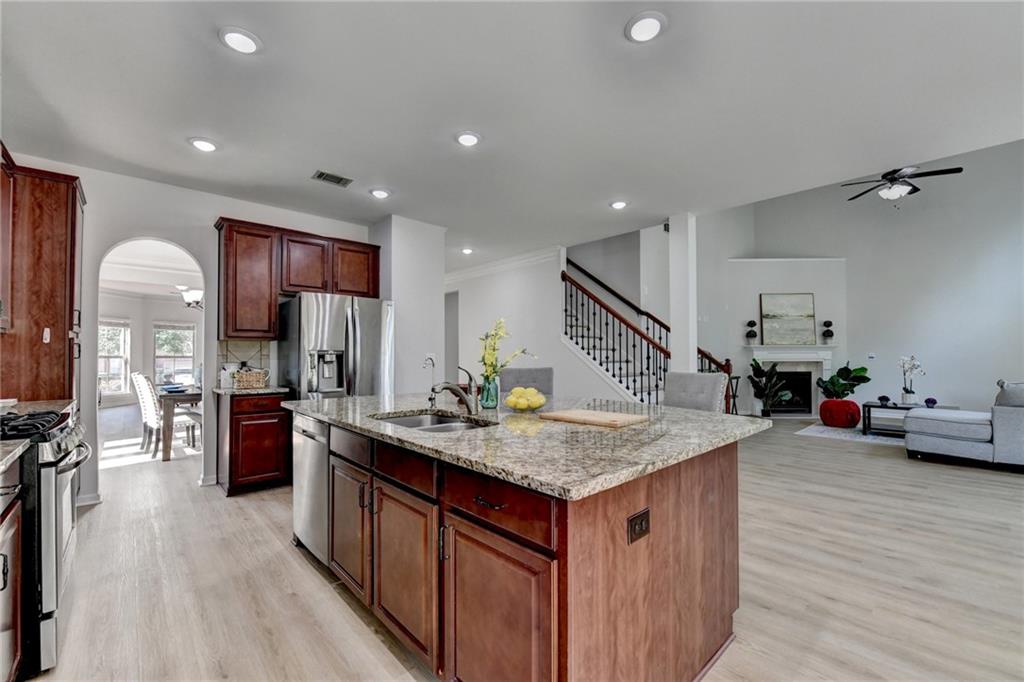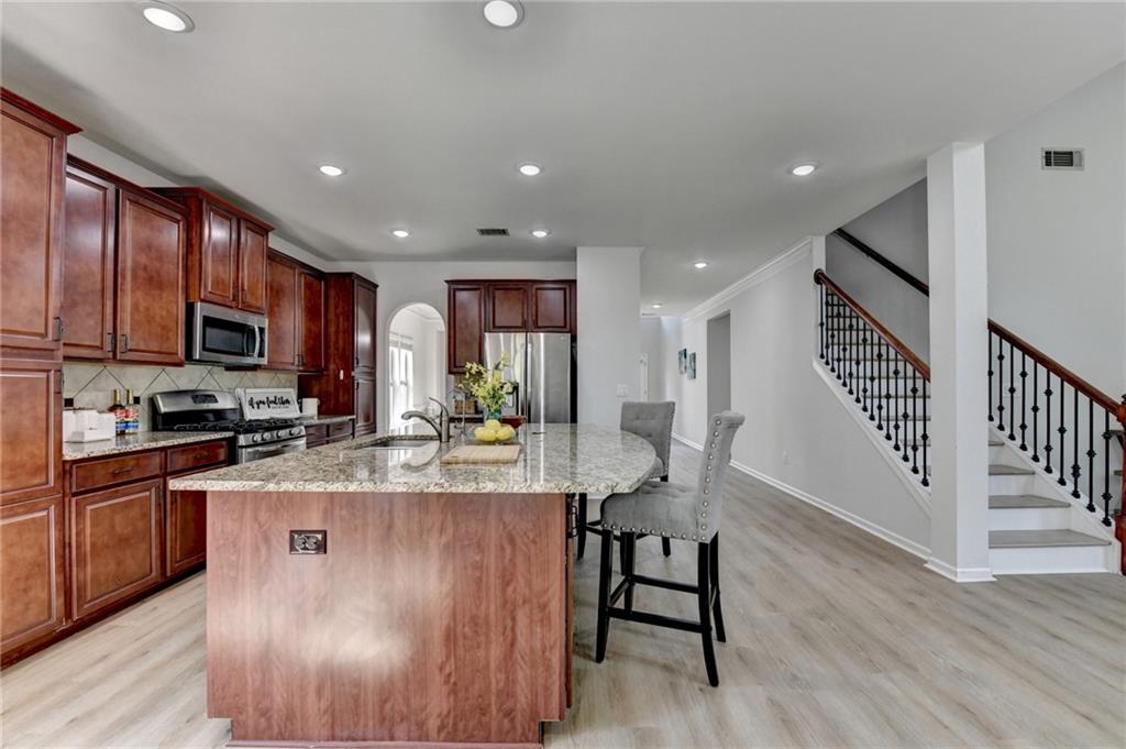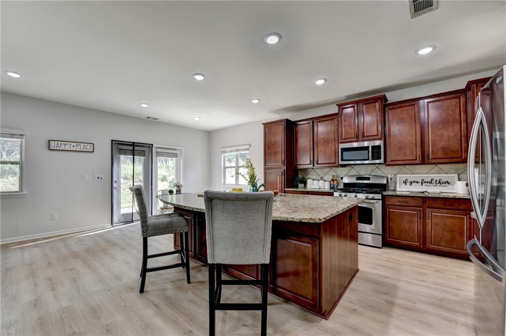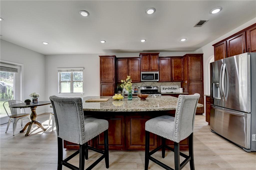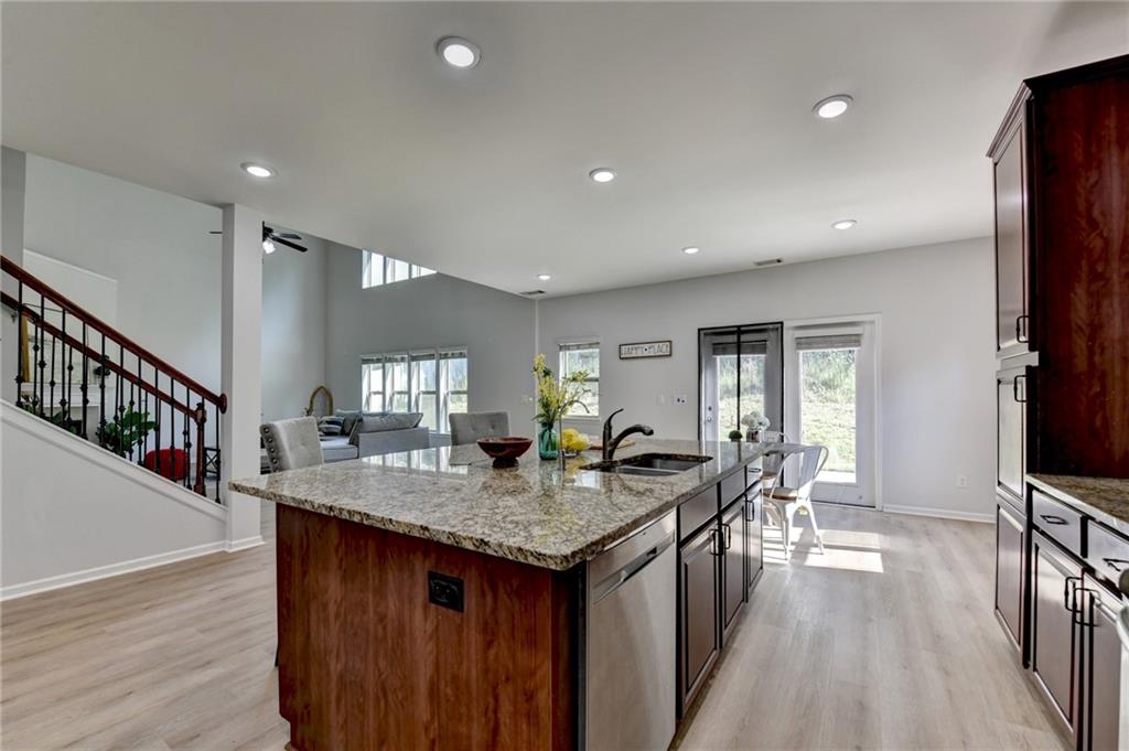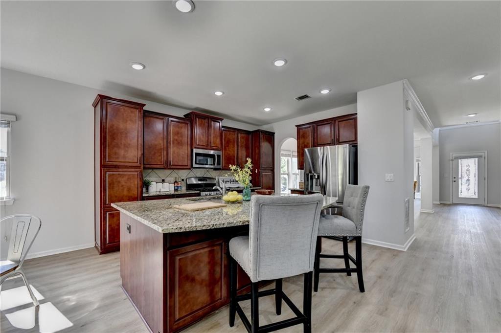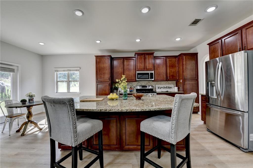 - KitchenBreakfast Bar, Cabinets Stain, Kitchen Island, View to Family Room, Stone Counters