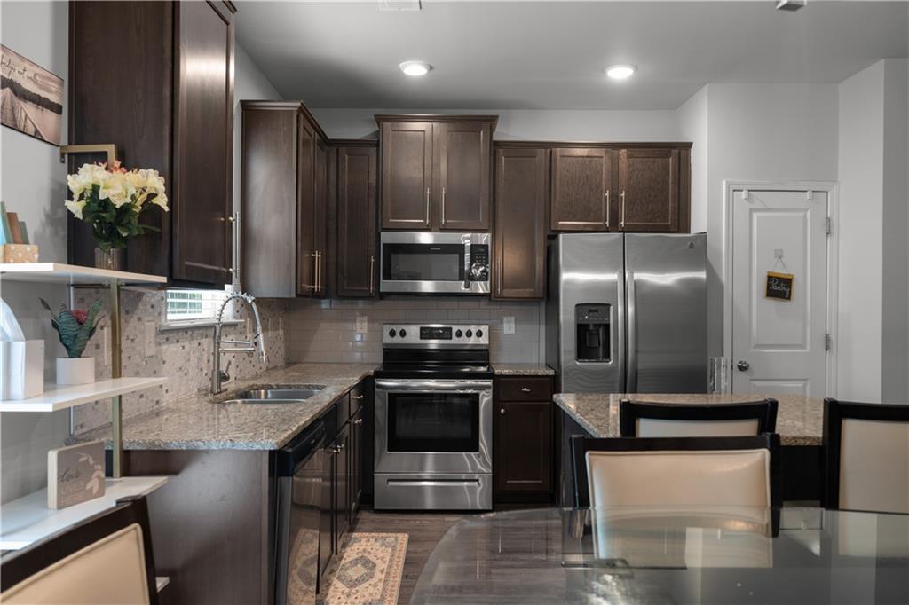 Welcome to this beautifully maintained two-story townhome featuring 2 spacious bedrooms and 2.5 baths. The open-concept floor plan offers a seamless flow between the dining area and the family room, creating an inviting space perfect for everyday living and entertaining. The kitchen is a standout with its 42" cabinets, granite countertops, walk-in pantry, upgraded faucet, and a central island—ideal for casual dining or meal prep. Stainless steel appliances, including an electric range, dishwasher, and microwave, complete the modern kitchen setup. Upstairs, the large owner’s suite boasts double vanities and a generous walk-in closet. The second bedroom also includes its own private bath, making this an ideal layout for roommates or guests. This move-in ready townhome combines comfort, style, and function—don’t miss the opportunity to make it yours!