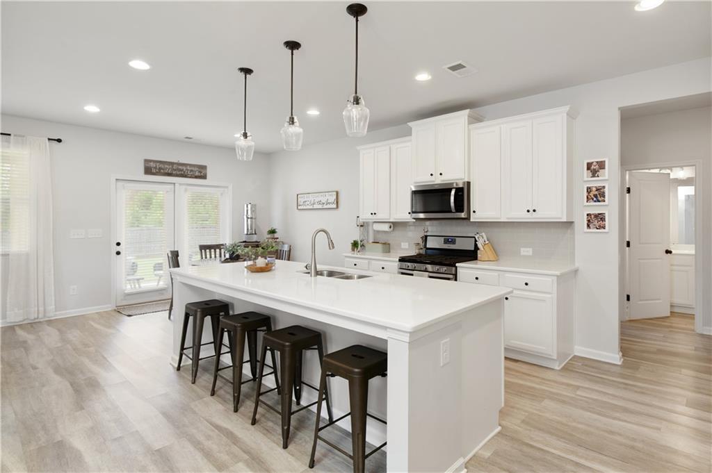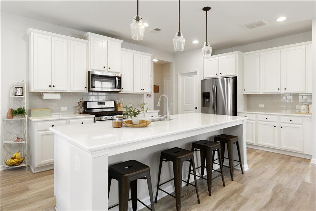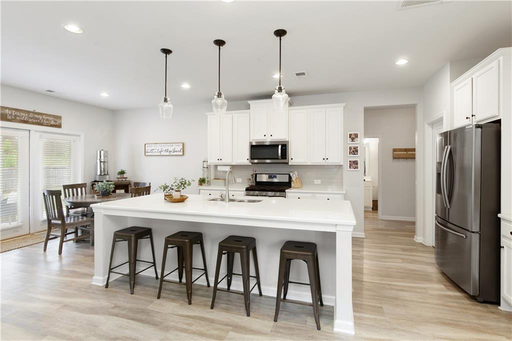 - KitchenBreakfast Bar, Cabinets White, Eat-in Kitchen, Kitchen Island, Pantry, Stone Counters, View to Family Room