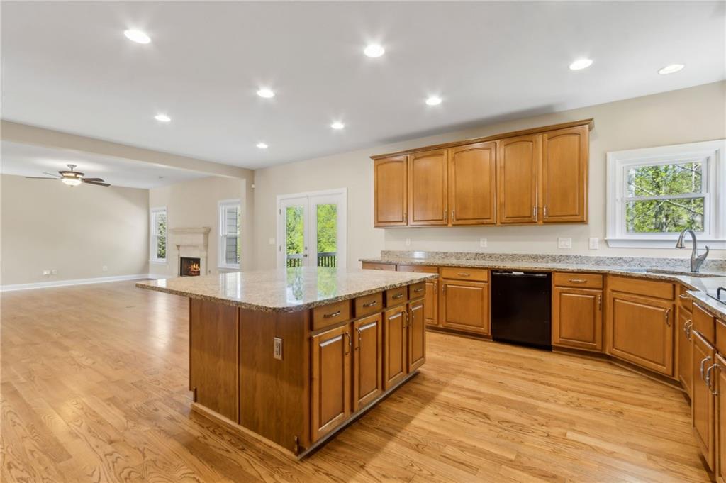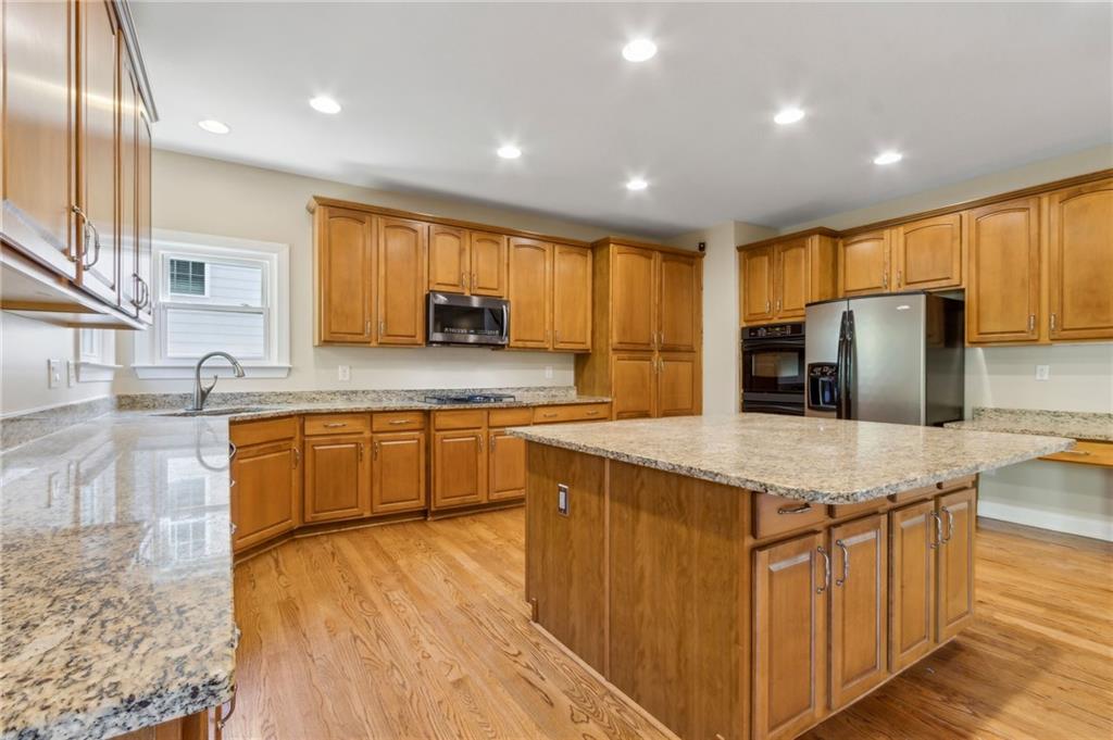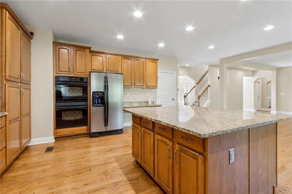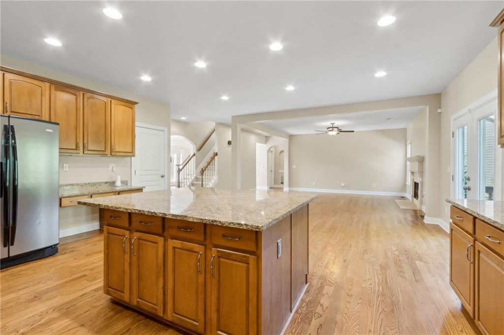 - KitchenBreakfast Bar, Breakfast Room, Cabinets Stain, Kitchen Island, Pantry, Stone Counters, View to Family Room