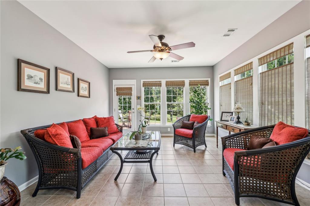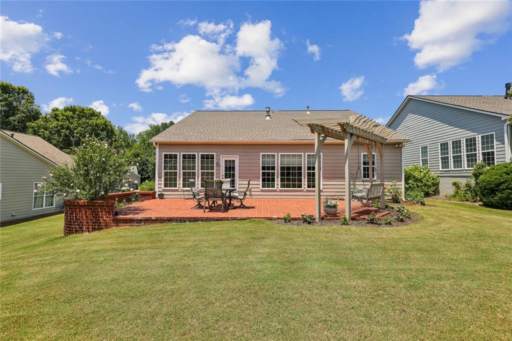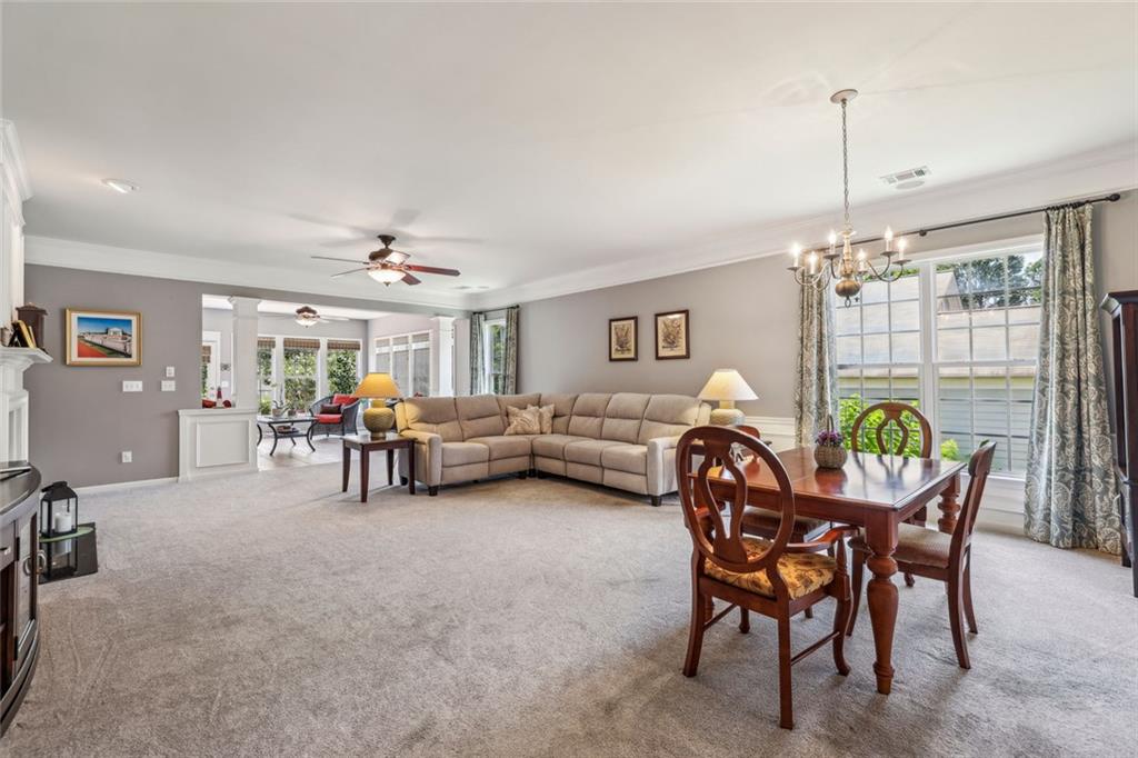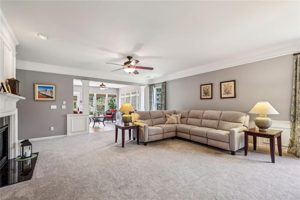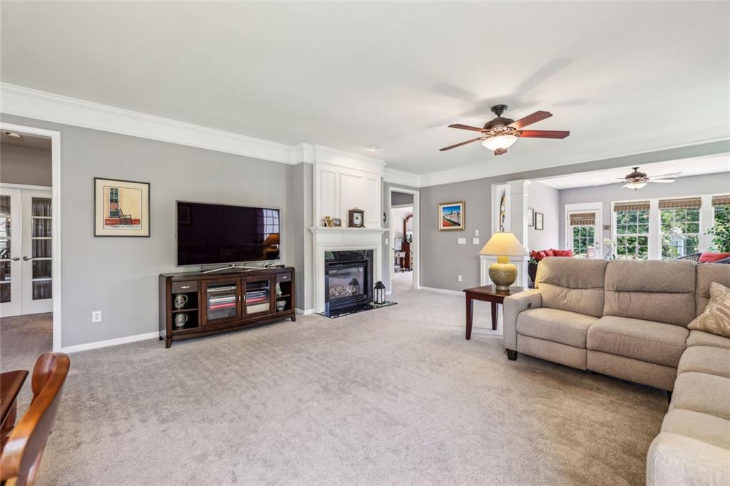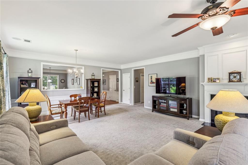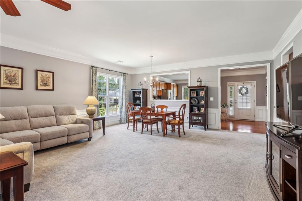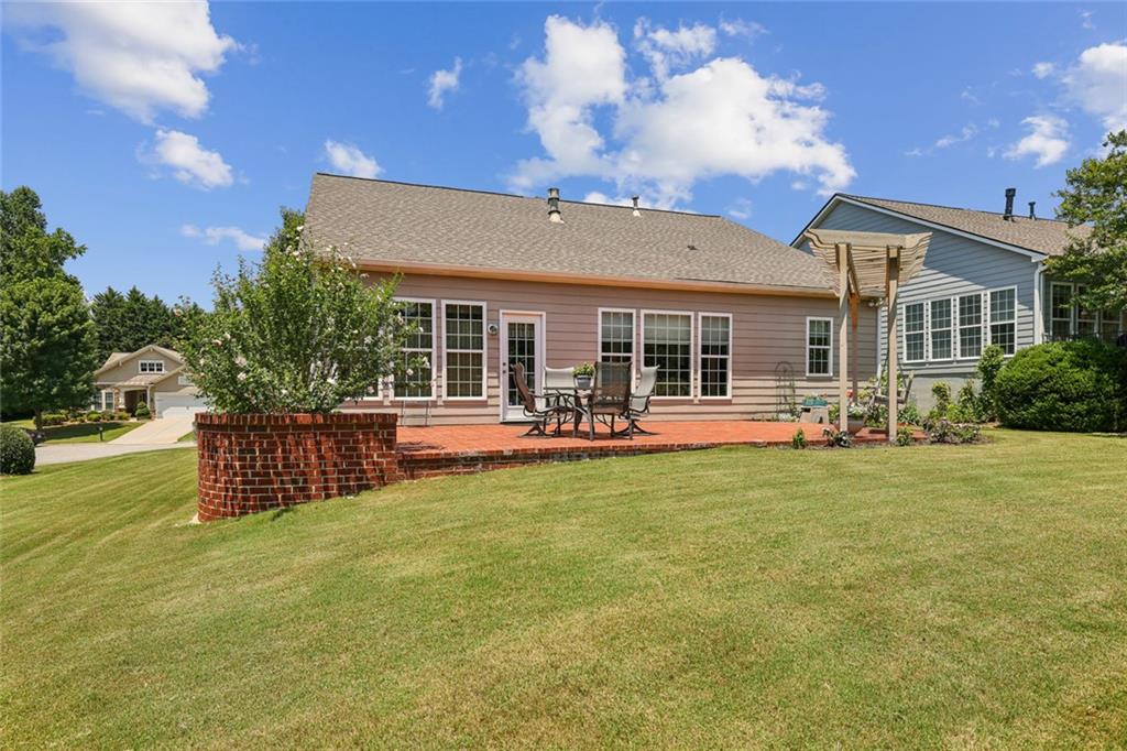 Charming Craftsman Ranch in Coveted Kingswood Community has been meticulously maintained and kept in pristine condition. This cheerful and inviting home is filled with warmth, charm, thoughtful upgrades and outstanding curb appeal—perfectly suited for relaxed, low-maintenance living. Residents of Kingswood enjoy resort-style amenities, including a clubhouse, swimming pool, tennis and pickleball courts, and a dog park. A vibrant HOA hosts social events, exercise classes, and holiday gatherings. Even better—your monthly HOA dues include full lawn care and shrub care for your yard. A Spacious and Elegant Interior; step through the impressive foyer into a sun-drenched open-concept living space that includes the Kitchen, Breakfast Area, Dining Room, Living Room, and Sunroom. Light pours in from three sides, creating a welcoming environment perfect for entertaining or everyday comfort. Fresh neutral paint, upgraded carpet, and wide crown molding throughout elevate the look and feel of the home. The smartly-designed Kitchen features richly stained cabinets, granite countertops, tile backsplash, and stainless steel appliances, including a gas range. A floor-to-ceiling pantry cabinet, built-in desk, center island, and a cozy breakfast area make this kitchen as functional as it is beautiful. The expansive Living/Dining Room centers around a gas fireplace and flows seamlessly into a tiled-floor Sunroom—the ideal spot to enjoy your morning coffee or unwind with a good book. Step outside to a custom brick patio that overlooks a professionally landscaped, scenic rolling backyard—perfect for entertaining, painting, or peaceful reflection. The oversized Primary Suite features a tray ceiling, extra moldings, and large windows capturing serene backyard views. The ensuite bath offers dual vanities, a soaking tub, separate shower, private water closet, and a generous walk-in closet. Additional spaces to live and work; A secondary Bedroom with adjacent full Bath accommodates guests comfortably. A private Home Office with glass-paneled doors offers flexible use—TV room, hobby space, or extra guest quarters. The full-size Laundry Room and kitchen-level 2-car Garage provide everyday convenience. The Kingswood at Castleberry neighborhood is perfectly situated in sought-after South Forsyth; minutes from GA-400, The Collection at Forsyth, Northside Hospital, Cumming City Center, and the new Whole Foods Market opening this fall.