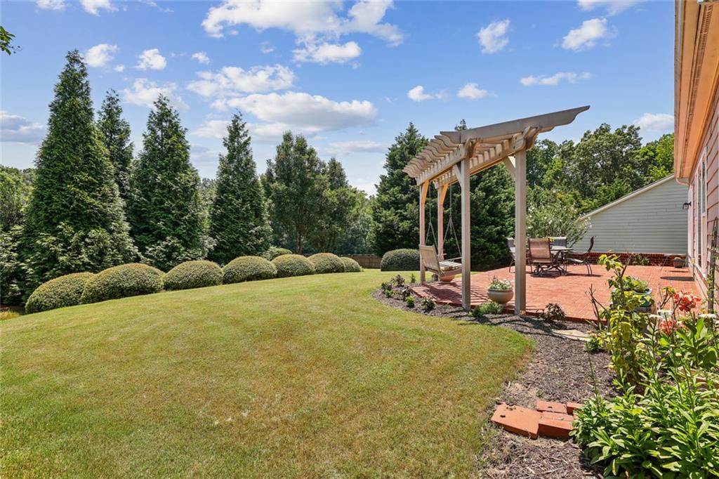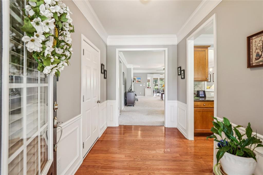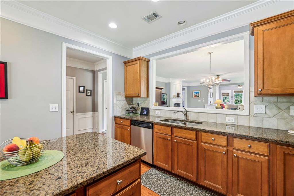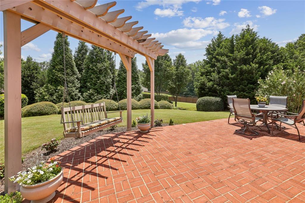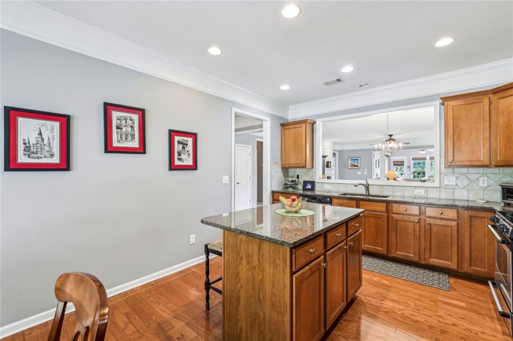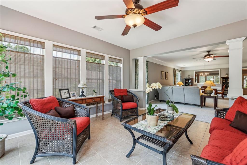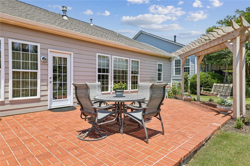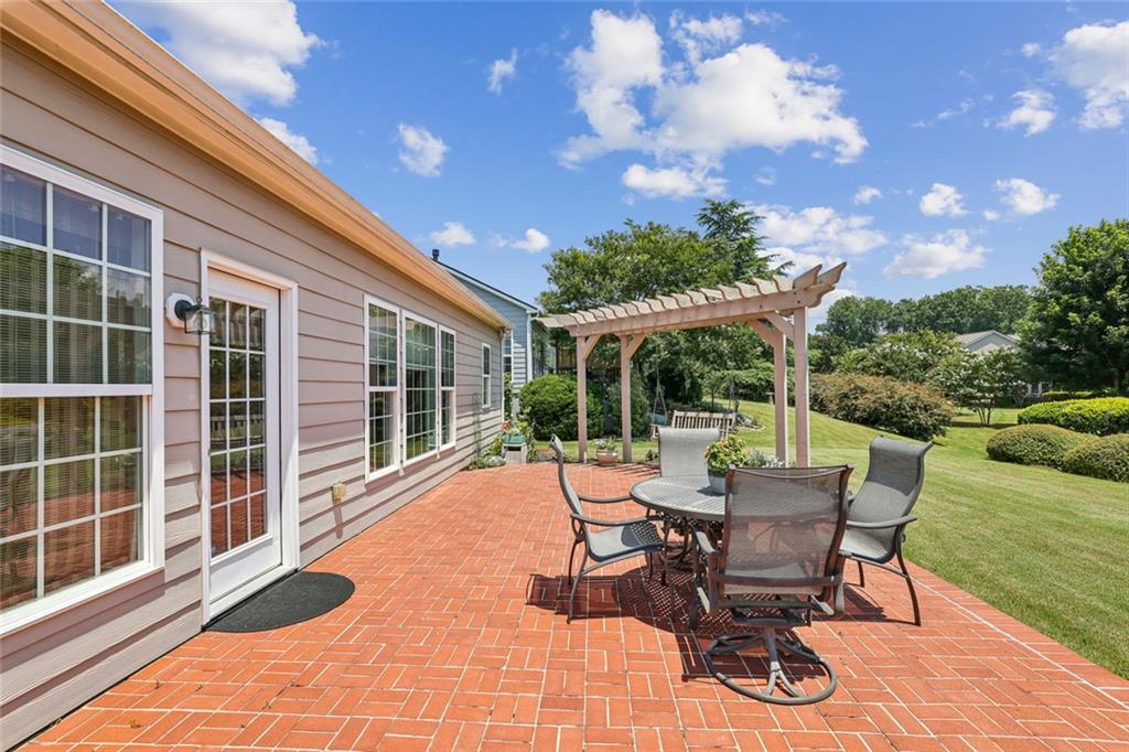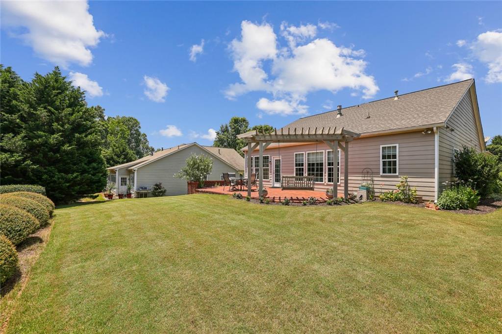 Charming Craftsman Ranch in Coveted Kingswood Community has been meticulously maintained and kept in pristine condition. This cheerful and inviting home is filled with warmth, charm, thoughtful upgrades and outstanding curb appeal—perfectly suited for relaxed, low-maintenance living. Residents of Kingswood enjoy resort-style amenities, including a clubhouse, swimming pool, tennis and pickleball courts, and a dog park. A vibrant HOA hosts social events, exercise classes, and holiday gatherings. Even better—your monthly HOA dues include full lawn care and shrub care for your yard. A Spacious and Elegant Interior; step through the impressive foyer into a sun-drenched open-concept living space that includes the Kitchen, Breakfast Area, Dining Room, Living Room, and Sunroom. Light pours in from three sides, creating a welcoming environment perfect for entertaining or everyday comfort. Fresh neutral paint, upgraded carpet, and wide crown molding throughout elevate the look and feel of the home. The smartly-designed Kitchen features richly stained cabinets, granite countertops, tile backsplash, and stainless steel appliances, including a gas range. A floor-to-ceiling pantry cabinet, built-in desk, center island, and a cozy breakfast area make this kitchen as functional as it is beautiful. The expansive Living/Dining Room centers around a gas fireplace and flows seamlessly into a tiled-floor Sunroom—the ideal spot to enjoy your morning coffee or unwind with a good book. Step outside to a custom brick patio that overlooks a professionally landscaped, scenic rolling backyard—perfect for entertaining, painting, or peaceful reflection. The oversized Primary Suite features a tray ceiling, extra moldings, and large windows capturing serene backyard views. The ensuite bath offers dual vanities, a soaking tub, separate shower, private water closet, and a generous walk-in closet. Additional spaces to live and work; A secondary Bedroom with adjacent full Bath accommodates guests comfortably. A private Home Office with glass-paneled doors offers flexible use—TV room, hobby space, or extra guest quarters. The full-size Laundry Room and kitchen-level 2-car Garage provide everyday convenience. The Kingswood at Castleberry neighborhood is perfectly situated in sought-after South Forsyth; minutes from GA-400, The Collection at Forsyth, Northside Hospital, Cumming City Center, and the new Whole Foods Market opening this fall.
