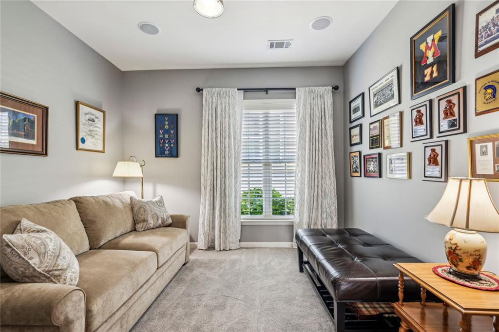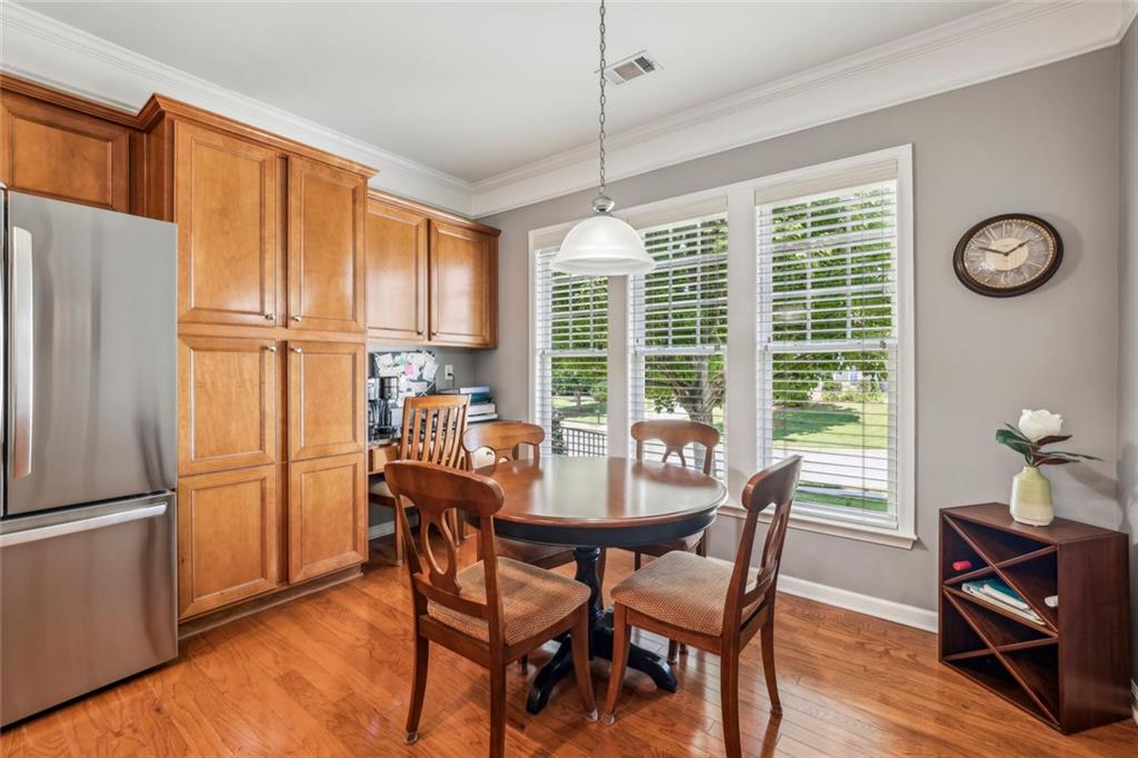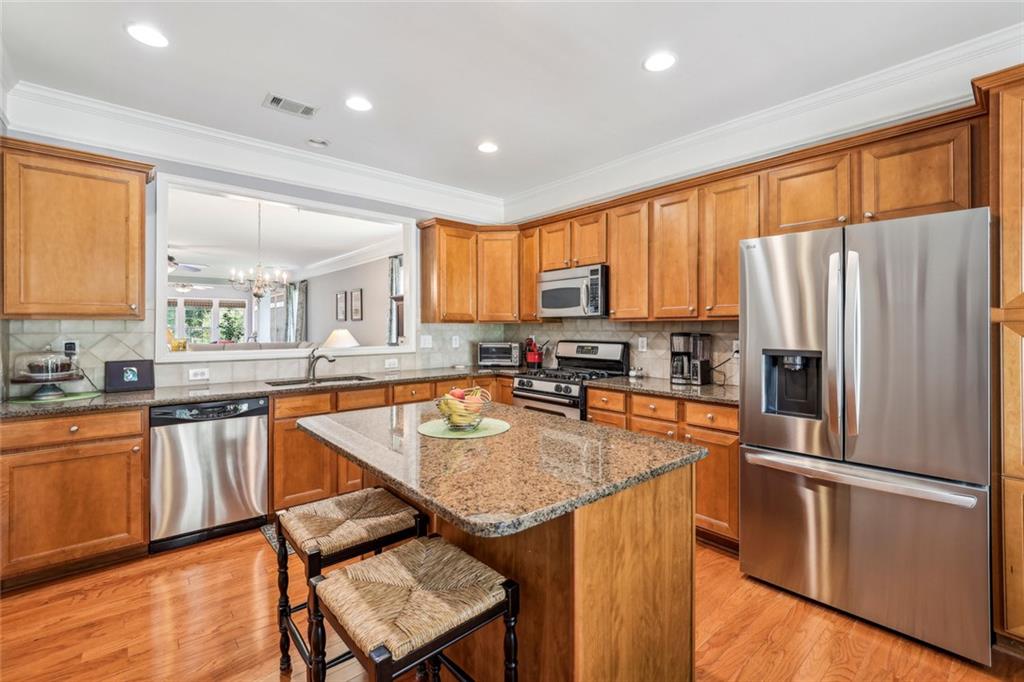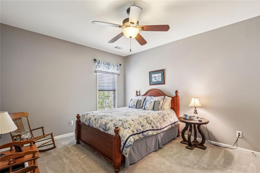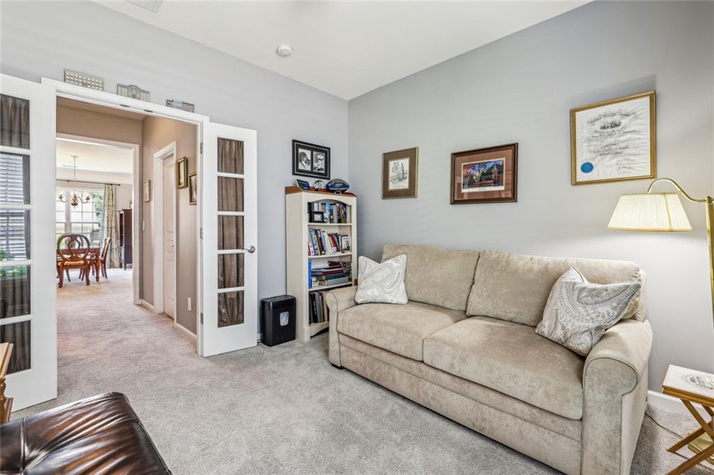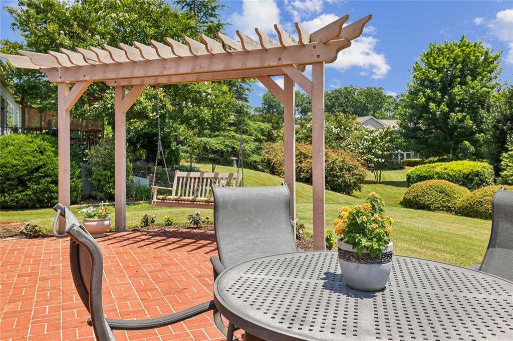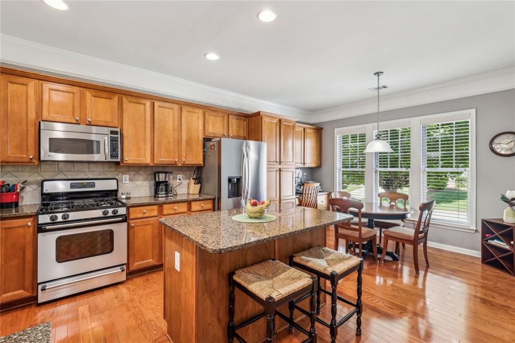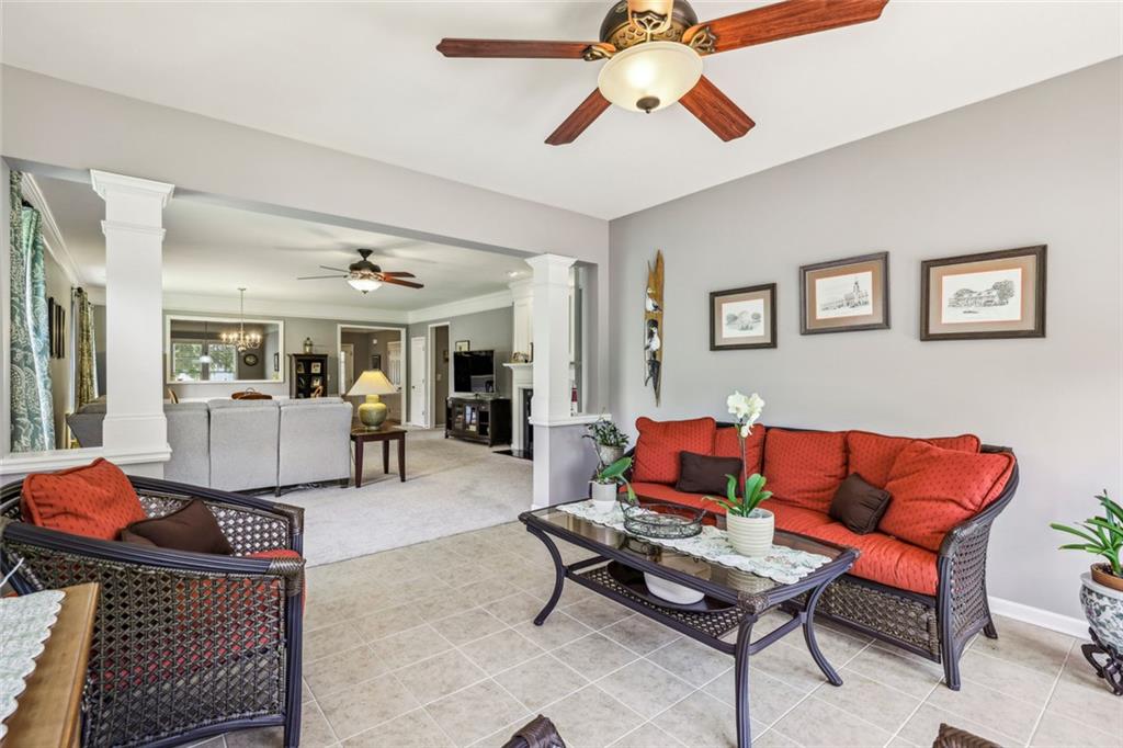 Charming Craftsman Ranch in Coveted Kingswood Community has been meticulously maintained and kept in pristine condition. This cheerful and inviting home is filled with warmth, charm, thoughtful upgrades and outstanding curb appeal—perfectly suited for relaxed, low-maintenance living. Residents of Kingswood enjoy resort-style amenities, including a clubhouse, swimming pool, tennis and pickleball courts, and a dog park. A vibrant HOA hosts social events, exercise classes, and holiday gatherings. Even better—your monthly HOA dues include full lawn care and shrub care for your yard. A Spacious and Elegant Interior; step through the impressive foyer into a sun-drenched open-concept living space that includes the Kitchen, Breakfast Area, Dining Room, Living Room, and Sunroom. Light pours in from three sides, creating a welcoming environment perfect for entertaining or everyday comfort. Fresh neutral paint, upgraded carpet, and wide crown molding throughout elevate the look and feel of the home. The smartly-designed Kitchen features richly stained cabinets, granite countertops, tile backsplash, and stainless steel appliances, including a gas range. A floor-to-ceiling pantry cabinet, built-in desk, center island, and a cozy breakfast area make this kitchen as functional as it is beautiful. The expansive Living/Dining Room centers around a gas fireplace and flows seamlessly into a tiled-floor Sunroom—the ideal spot to enjoy your morning coffee or unwind with a good book. Step outside to a custom brick patio that overlooks a professionally landscaped, scenic rolling backyard—perfect for entertaining, painting, or peaceful reflection. The oversized Primary Suite features a tray ceiling, extra moldings, and large windows capturing serene backyard views. The ensuite bath offers dual vanities, a soaking tub, separate shower, private water closet, and a generous walk-in closet. Additional spaces to live and work; A secondary Bedroom with adjacent full Bath accommodates guests comfortably. A private Home Office with glass-paneled doors offers flexible use—TV room, hobby space, or extra guest quarters. The full-size Laundry Room and kitchen-level 2-car Garage provide everyday convenience. The Kingswood at Castleberry neighborhood is perfectly situated in sought-after South Forsyth; minutes from GA-400, The Collection at Forsyth, Northside Hospital, Cumming City Center, and the new Whole Foods Market opening this fall.
