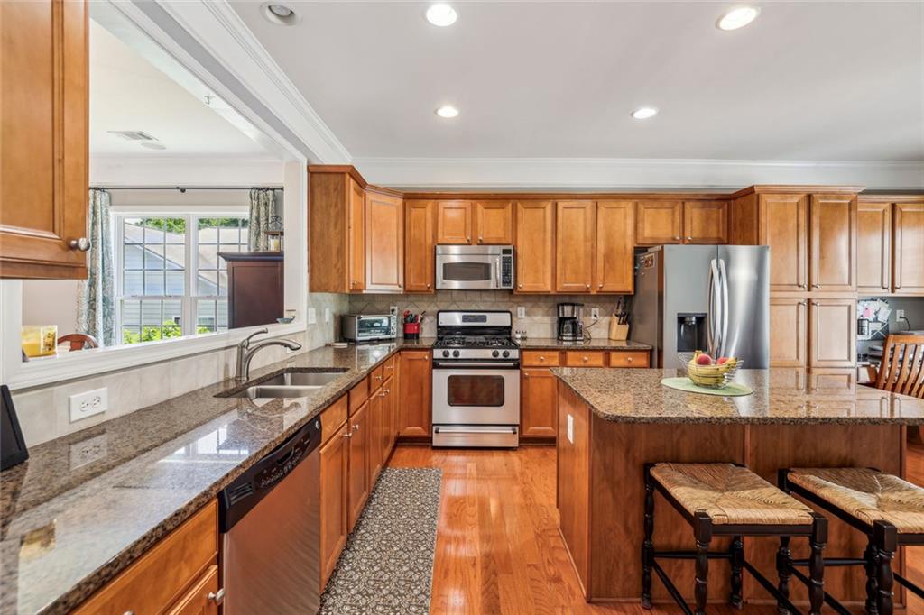- KitchenBreakfast Bar, Cabinets Stain, Eat-in Kitchen, Kitchen Island, Stone Counters, View to Family Room