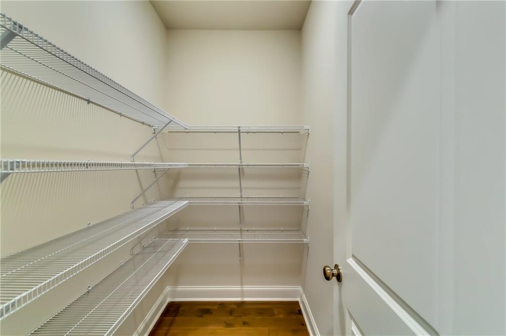- KitchenCabinets White, Kitchen Island, Pantry Walk-In, Solid Surface Counters, View to Family Room