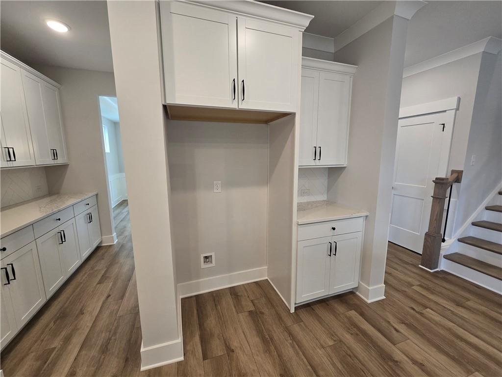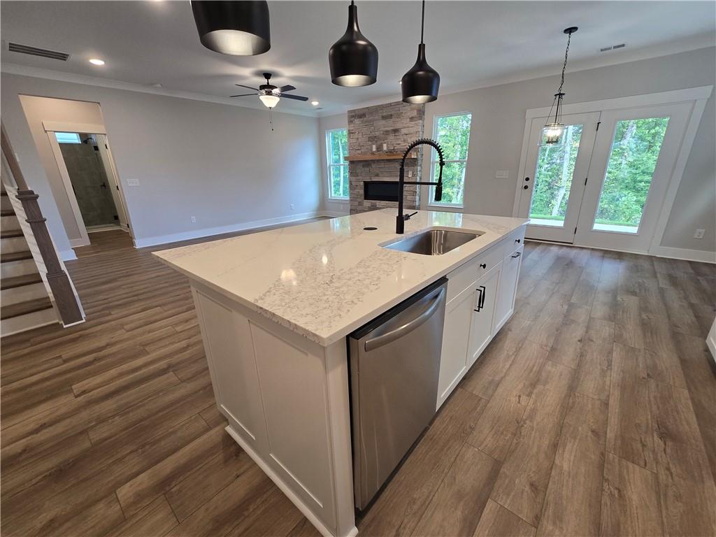 - KitchenBreakfast Bar, Cabinets White, Eat-in Kitchen, Pantry, Solid Surface Counters, View to Family Room