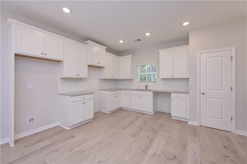 - KitchenCabinets White, Eat-in Kitchen, Solid Surface Counters, View to Family Room
