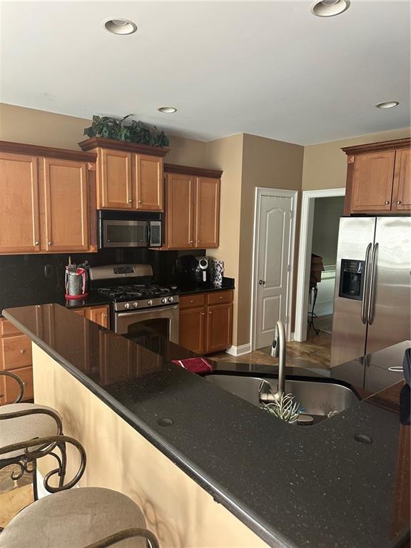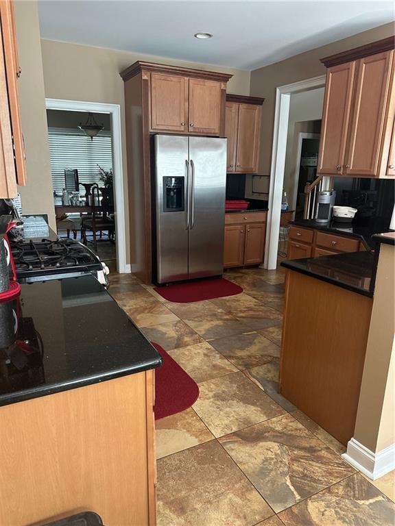 - KitchenCabinets Stain, Pantry Walk-In, Stone Counters, View to Family Room