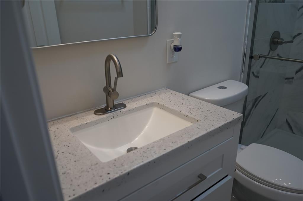 - KitchenBreakfast Bar, View to Family Room, Pantry, Kitchen Island, Stone Counters, Cabinets White