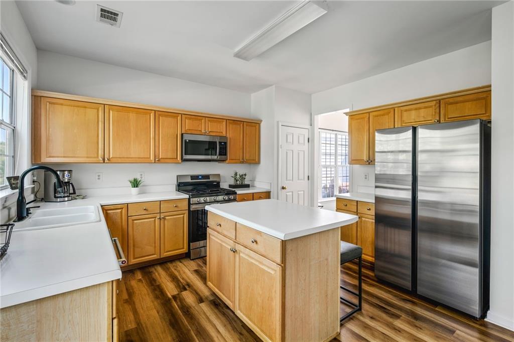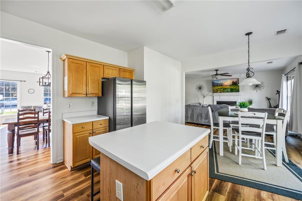 - KitchenCabinets Stain, Kitchen Island, Laminate Counters, Pantry, View to Family Room