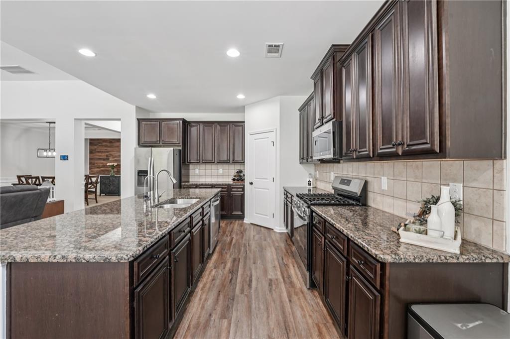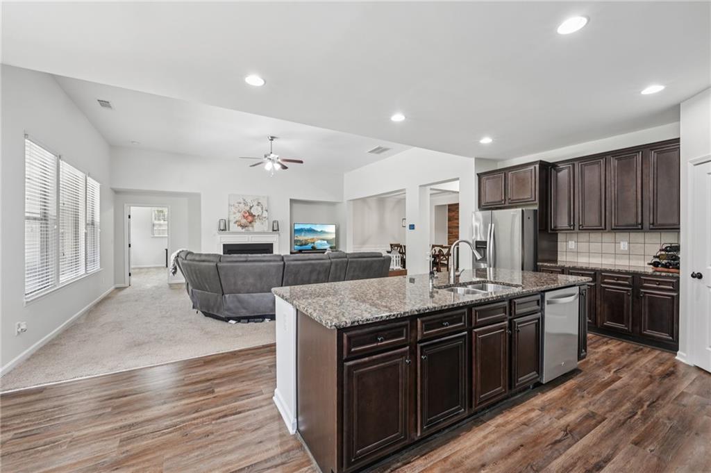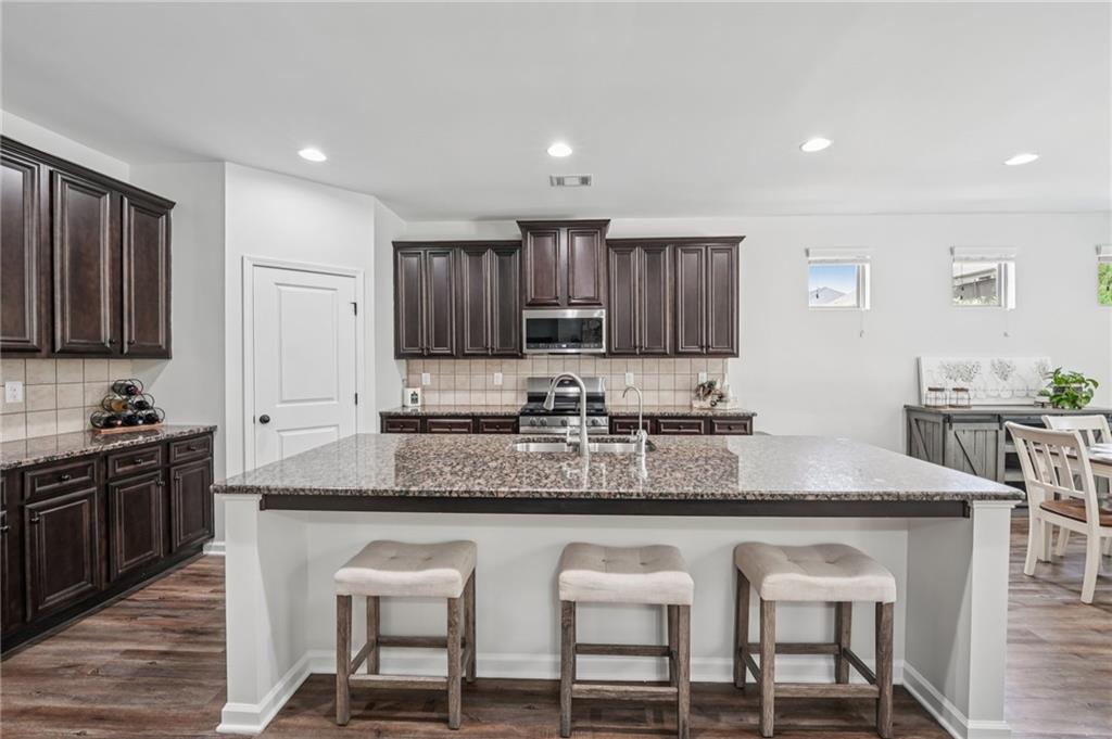 - KitchenBreakfast Bar, Breakfast Room, Kitchen Island, Pantry Walk-In, Stone Counters, View to Family Room