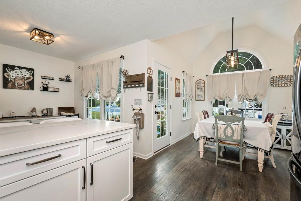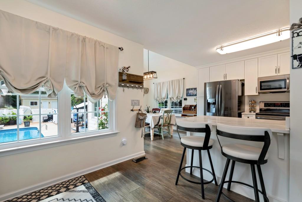 - KitchenBreakfast Bar, Cabinets White, Eat-in Kitchen, Stone Counters, View to Family Room