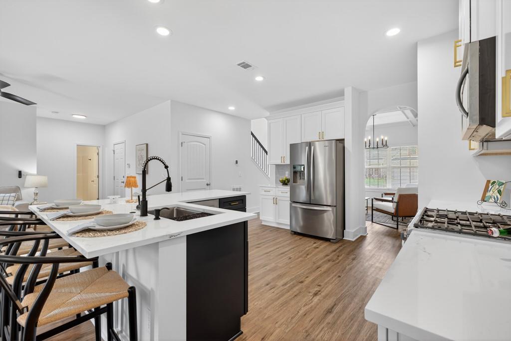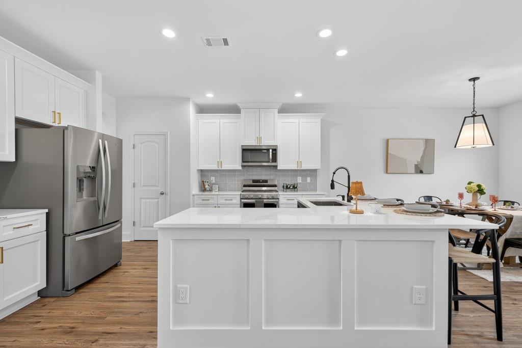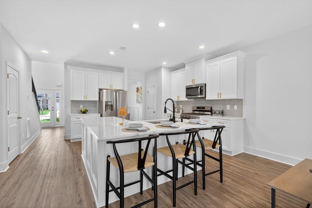 - KitchenBreakfast Bar, Cabinets White, Eat-in Kitchen, Kitchen Island, Pantry, Stone Counters, View to Family Room