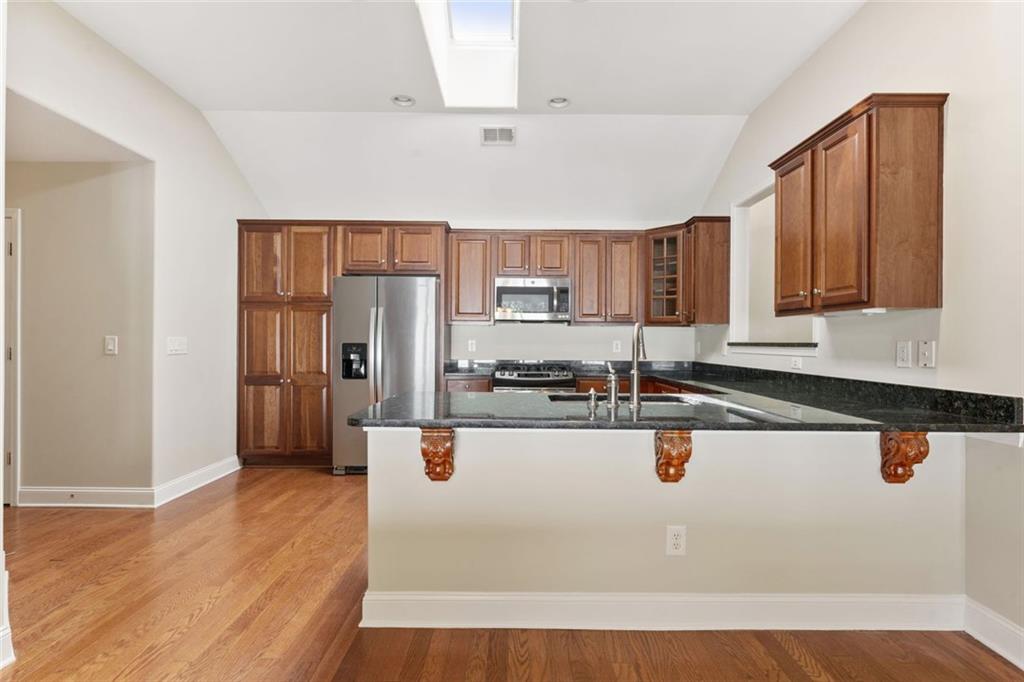 - KitchenBreakfast Bar, Cabinets Stain, Stone Counters, View to Family Room, Eat-in Kitchen