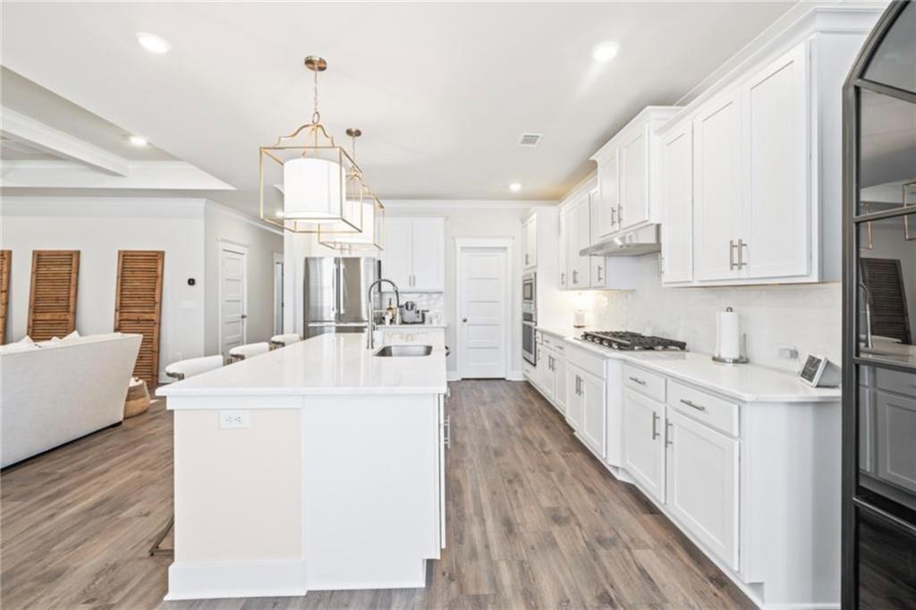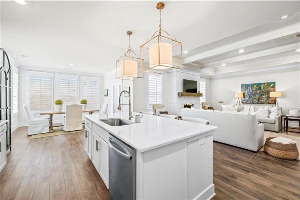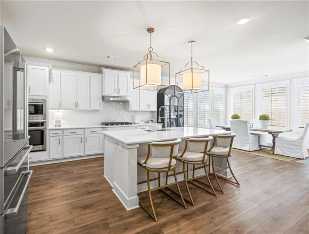 - KitchenBreakfast Bar, Breakfast Room, Cabinets White, Eat-in Kitchen, Kitchen Island, Pantry Walk-In, Solid Surface Counters, View to Family Room