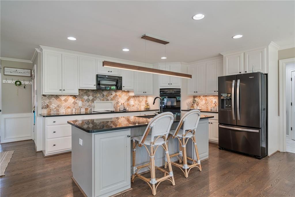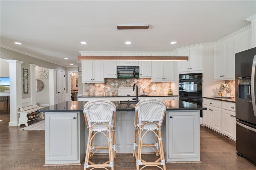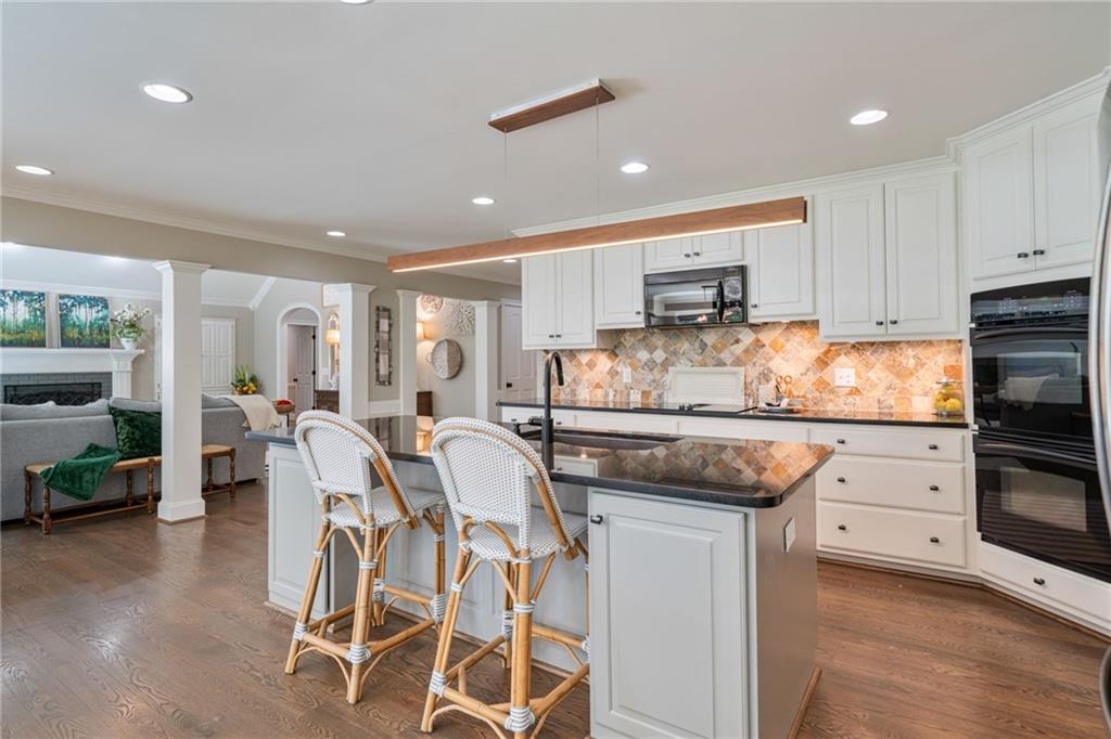 - KitchenBreakfast Room, Cabinets White, Eat-in Kitchen, Keeping Room, Kitchen Island, Pantry Walk-In, Stone Counters, View to Family Room