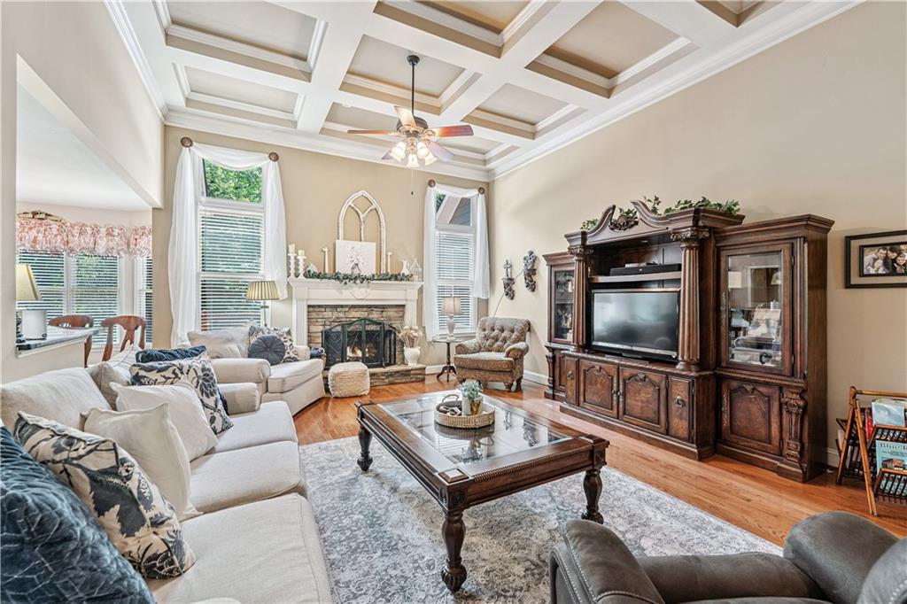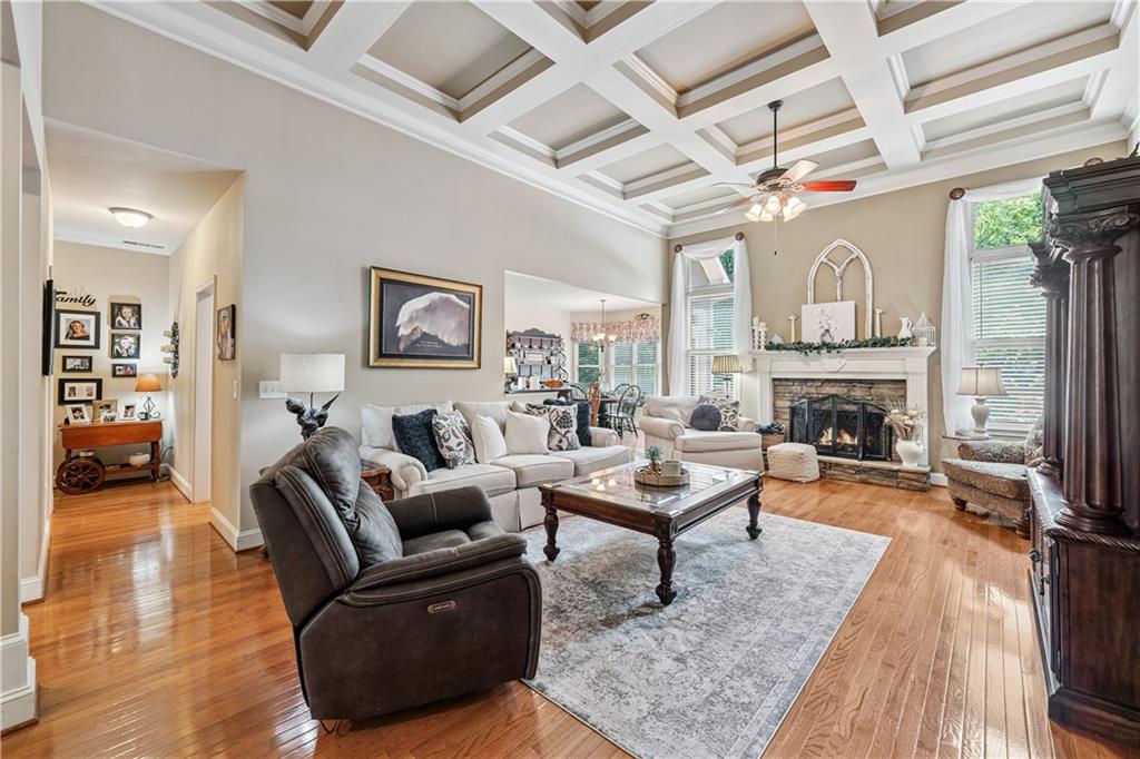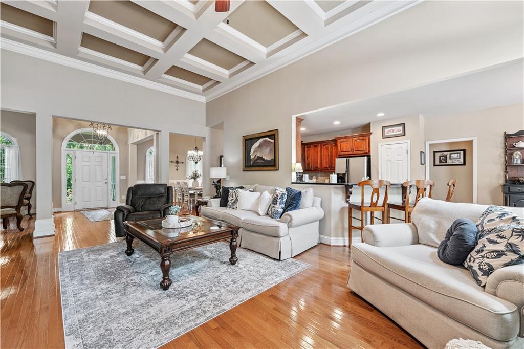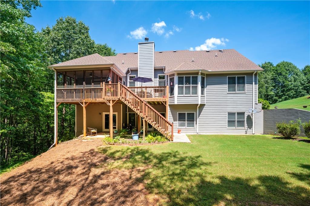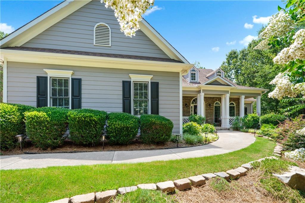 Welcome home to this custom-built 4-bedroom, 3.5-bath, one-owner ranch on a full, unfinished daylight basement situated on a large estate lot backing up to Lake Allatoona. You can walk to the lake and it's only 1 mile to the beach and boat access!! This home features a separate dining room, office/formal living room, and family room with soaring gorgeous coffered ceilings and a stone fireplace, open to a breakfast room and gourmet kitchen with granite countertops, stainless steel appliances, and plenty of storage. The primary suite on the main includes a vaulted tray ceiling and a beautifully updated ensuite bath with double vanity, separate whirlpool tub, glass shower, and a large closet. A sun porch/screened porch and sundeck are just off the master. Two additional bedrooms and a full bath are on the main floor and the fourth bedroom and full bath are upstairs, along with easy attic storage access. Access to the upstairs bedroom is just off the laundry area where a private staircase leads up. The main-level laundry room includes a sink and built-in cabinetry for added convenience. An extra-large two-car garage with side entry door offers easy access, and ample driveway parking offers convenience for family and guests. Additional features include hardwood floors, beautiful crown molding, plus a LARGE unfinished basement stubbed for a bath with a fantastic layout for future finishing. The basement also features two sets of French doors and two breaker boxes. Privately situated on a manicured lot with mature trees and a welcoming rocking chair front porch, this home is just minutes from Lake Allatoona, Sweetwater Creek State Park, and all the amenities Cherokee County has to offer.