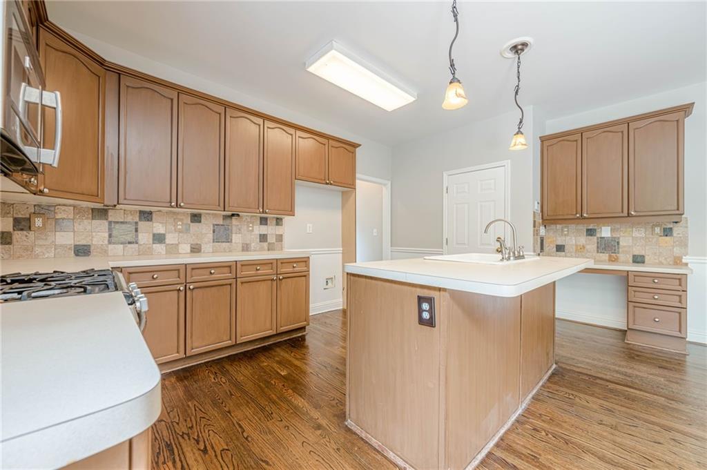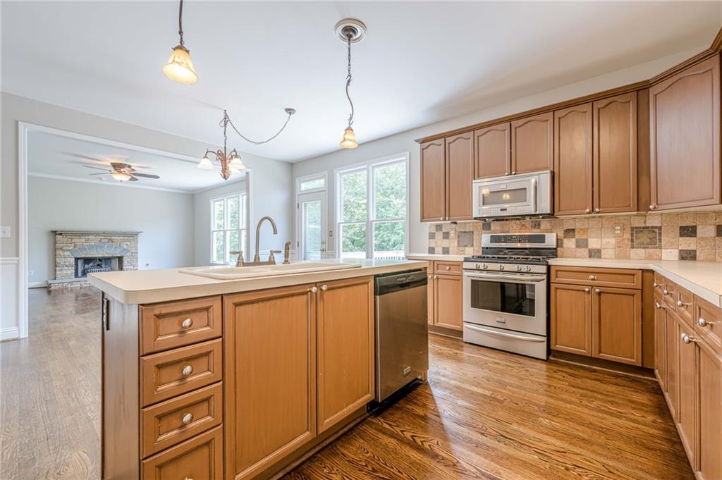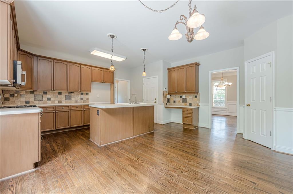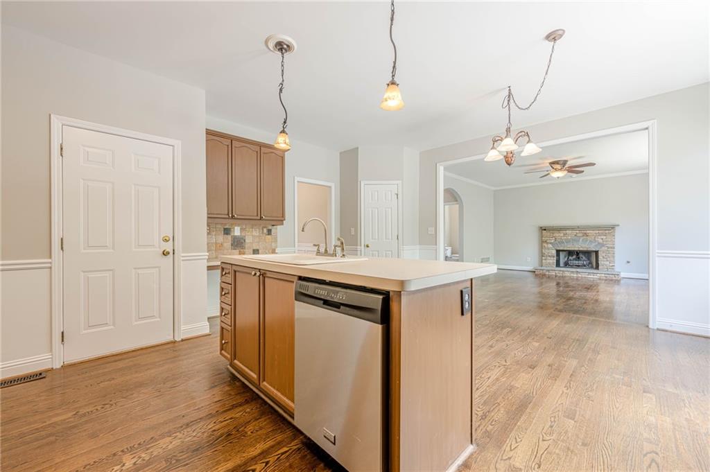 - KitchenCabinets Stain, Laminate Counters, Kitchen Island, Pantry, View to Family Room