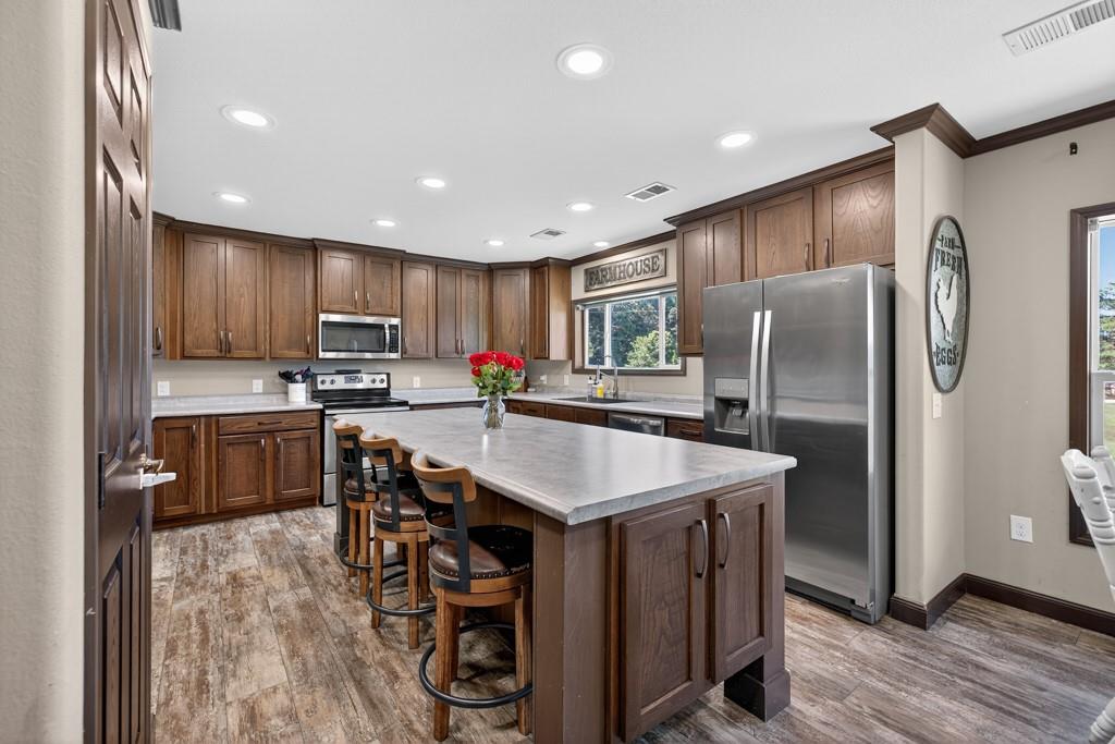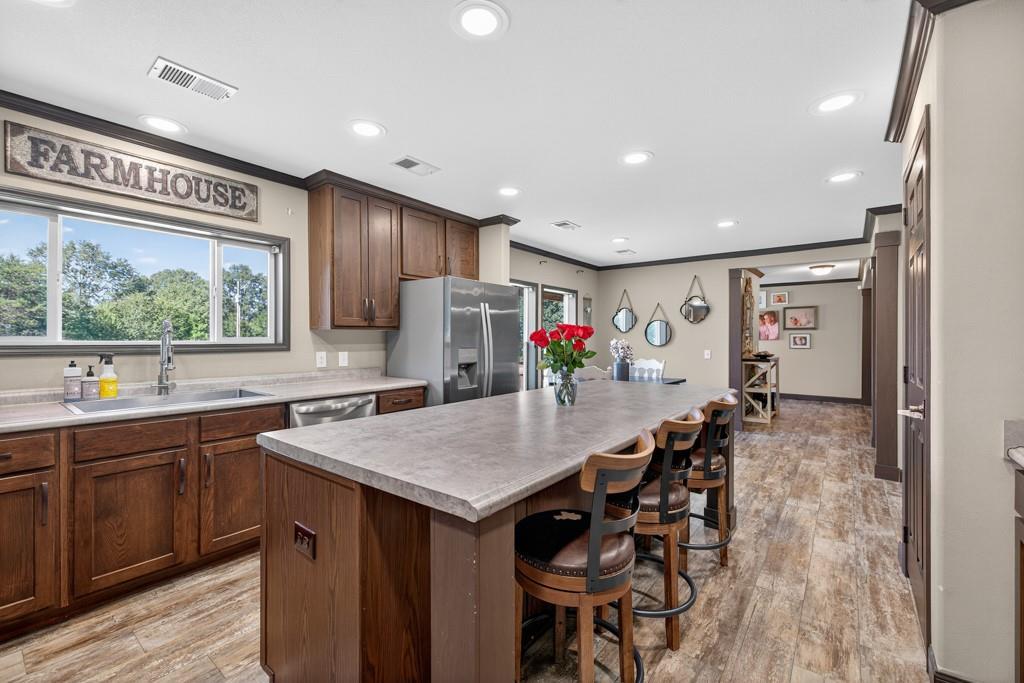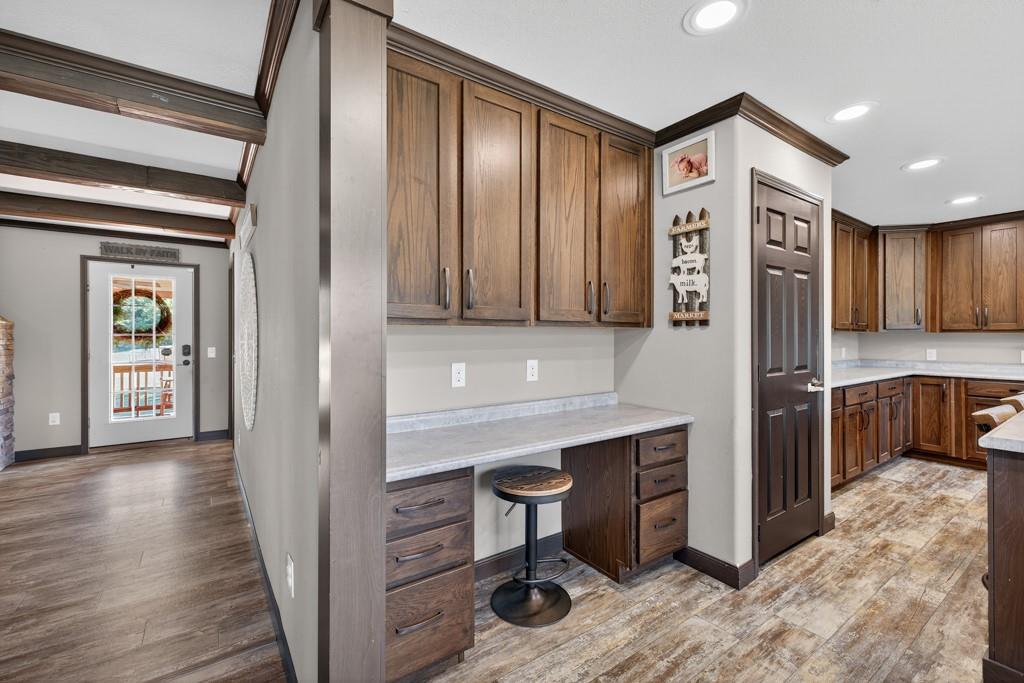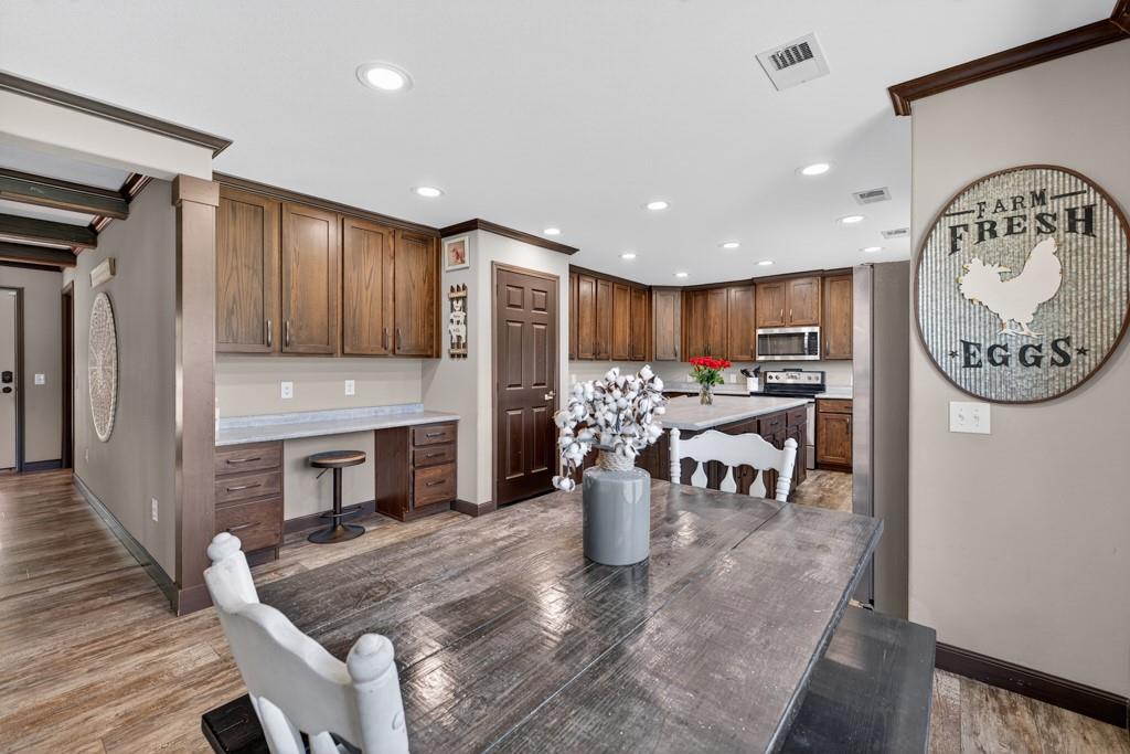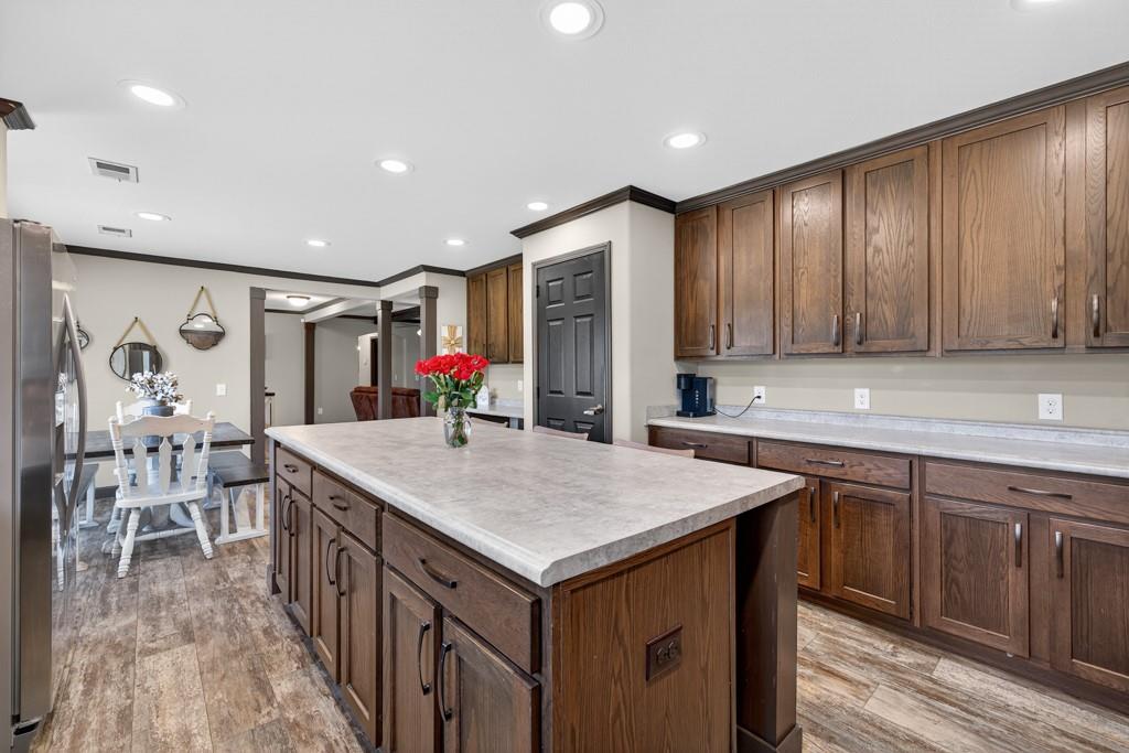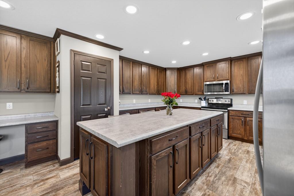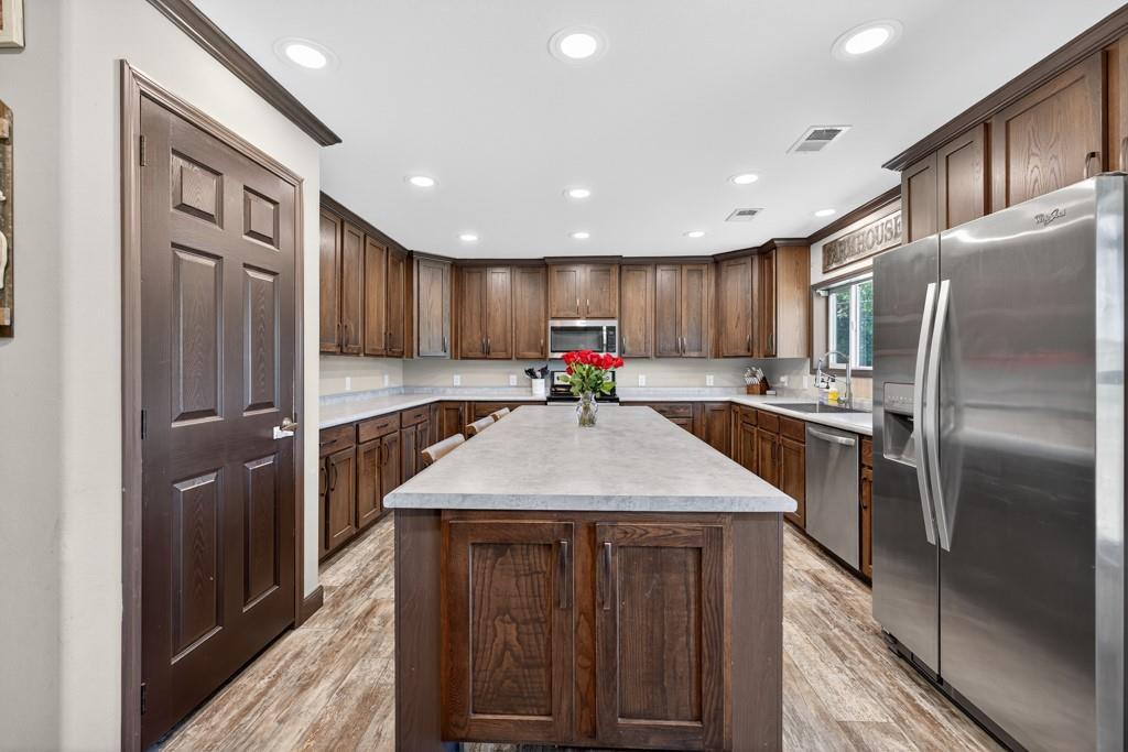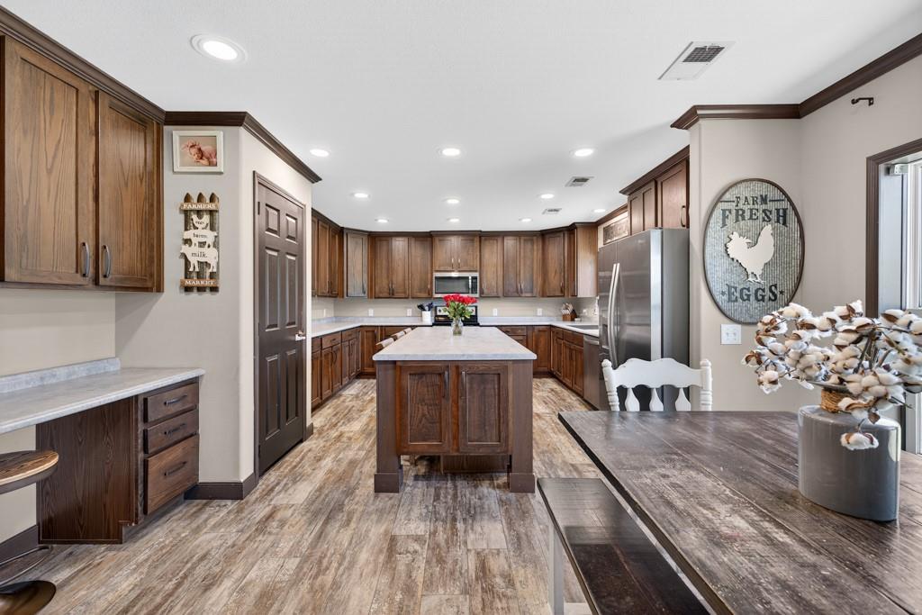 - KitchenBreakfast Bar, Breakfast Room, Cabinets Stain, Eat-in Kitchen, Kitchen Island, Laminate Counters, Pantry, View to Family Room