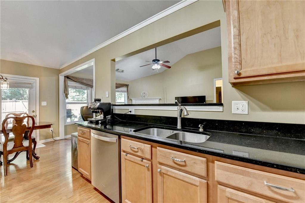 - KitchenBreakfast Bar, Breakfast Room, Cabinets Stain, Pantry, Stone Counters, View to Family Room