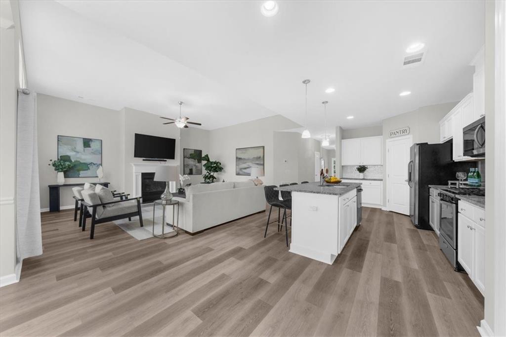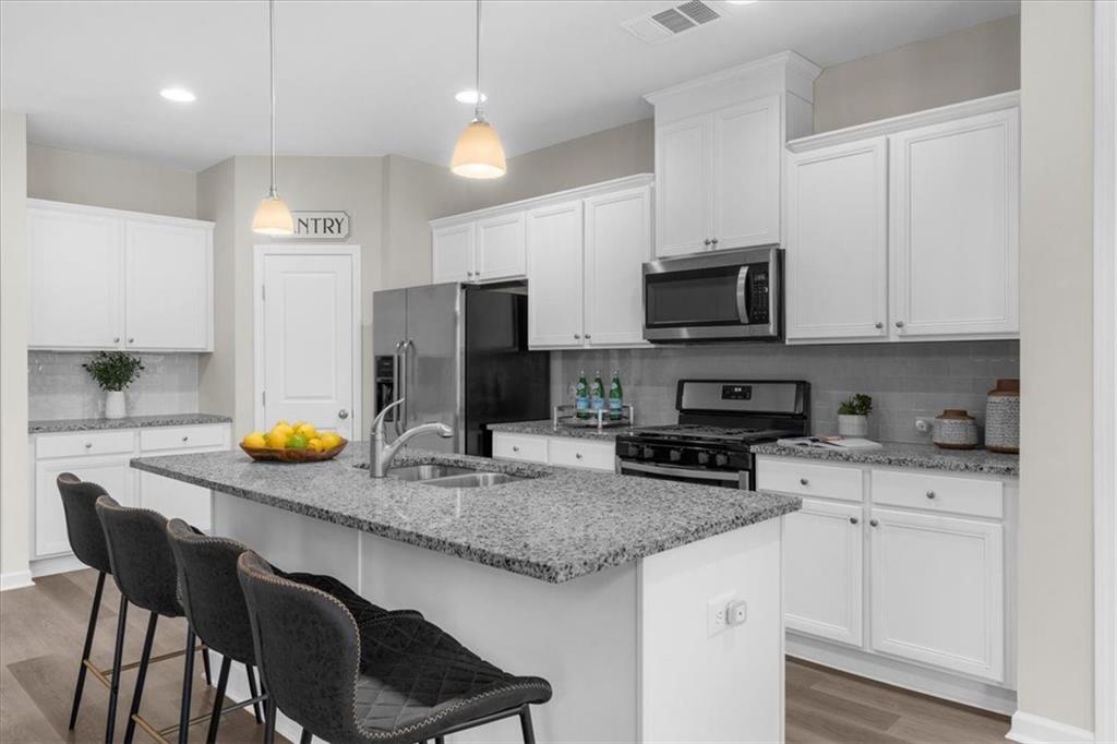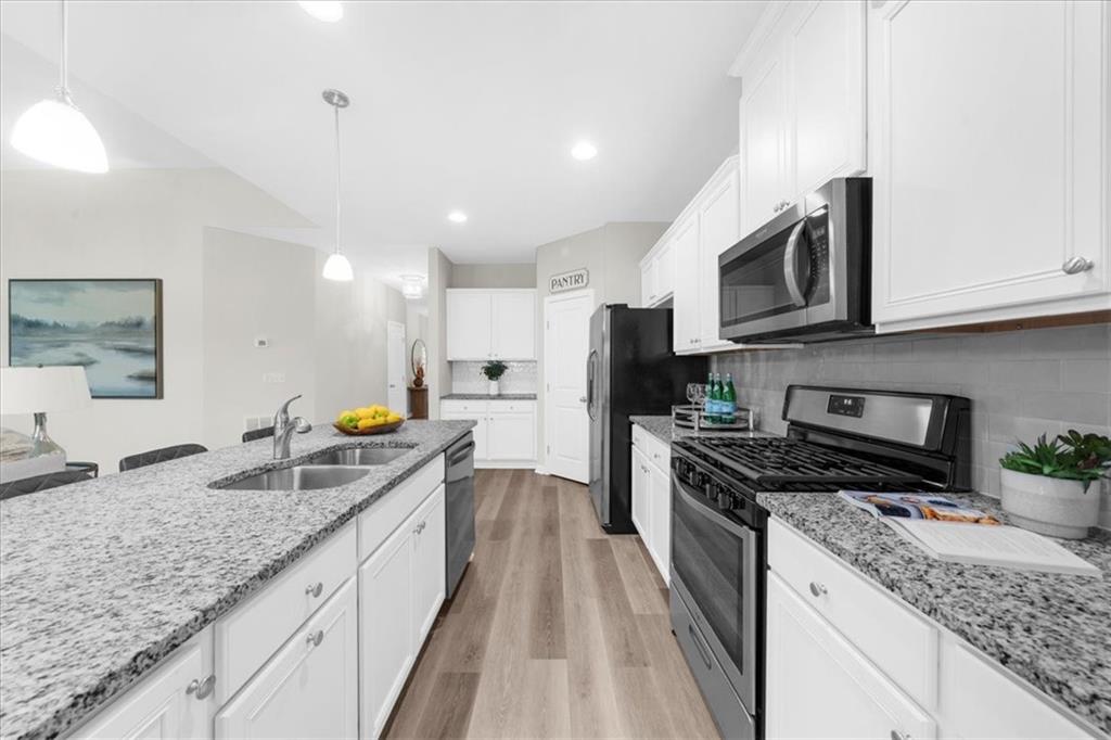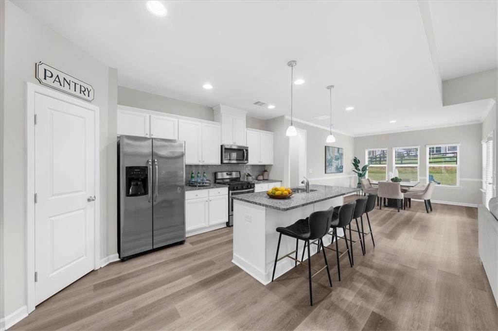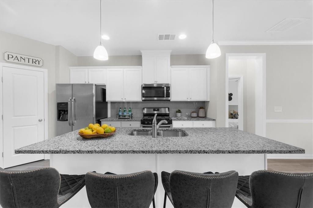 - KitchenBreakfast Bar, Cabinets White, Kitchen Island, Pantry Walk-In, Stone Counters, View to Family Room