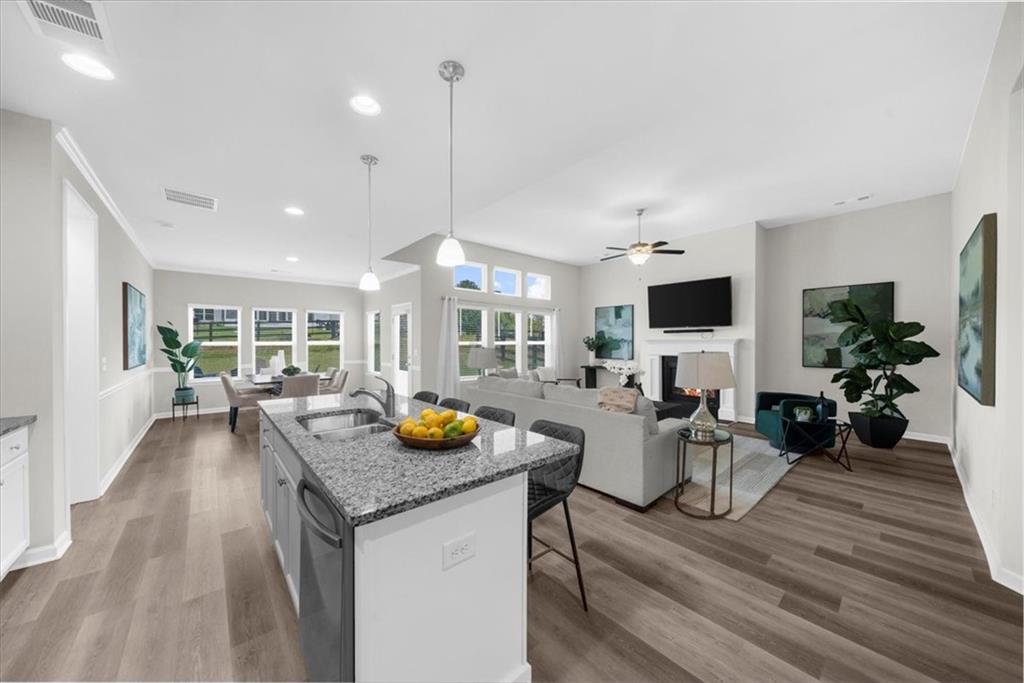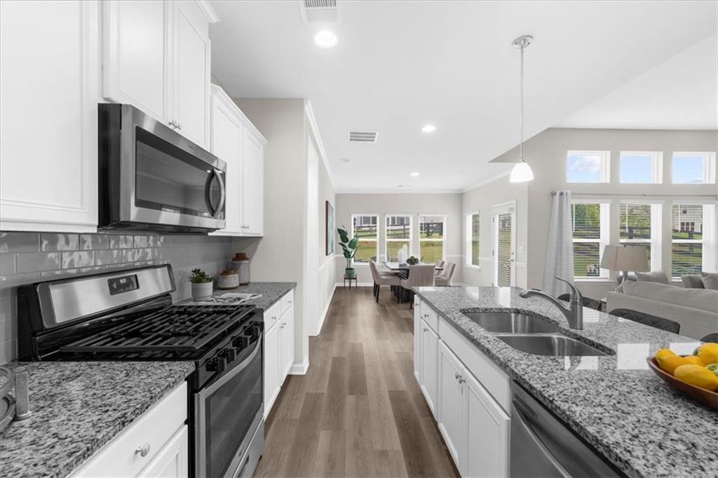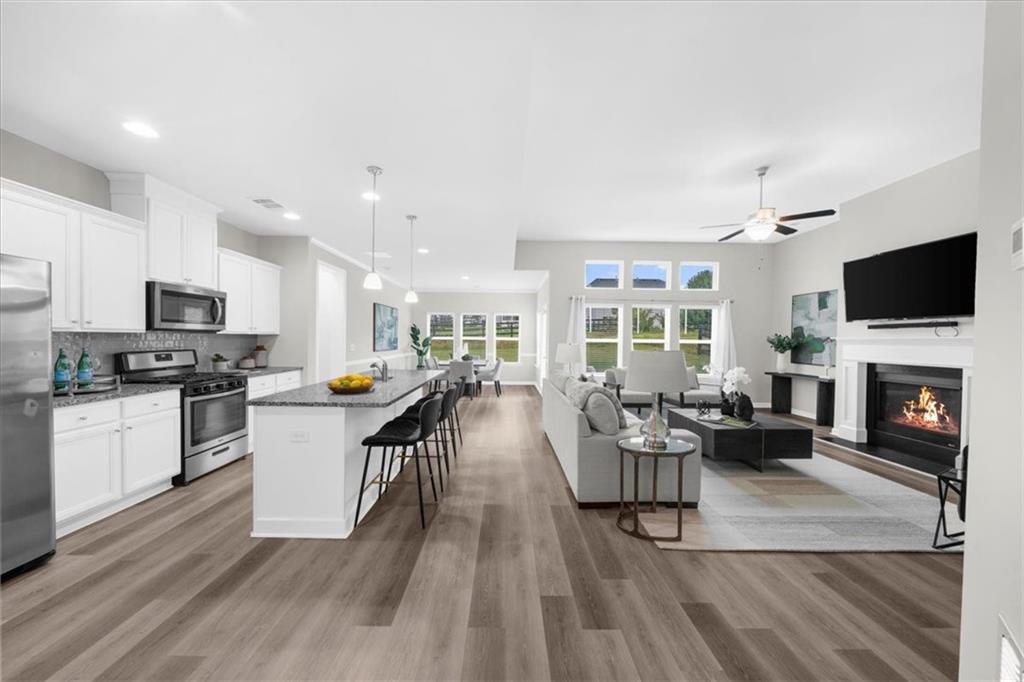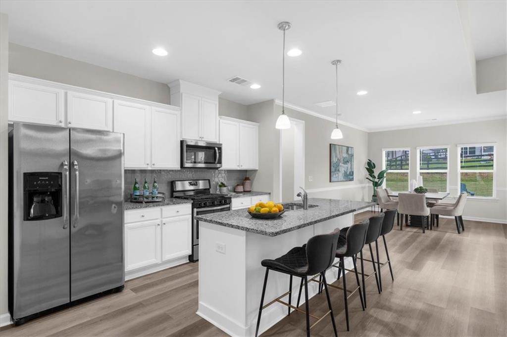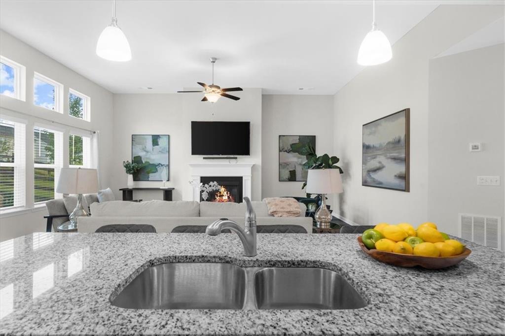 - KitchenBreakfast Bar, Cabinets White, Kitchen Island, Pantry Walk-In, Stone Counters, View to Family Room