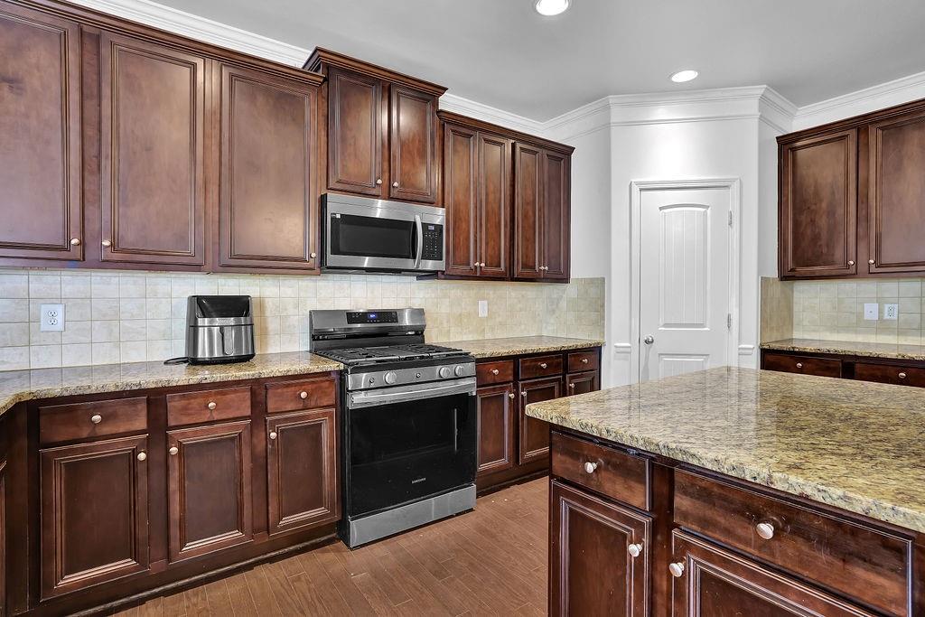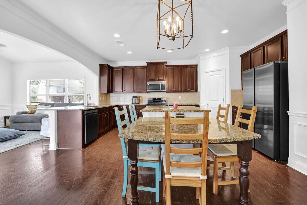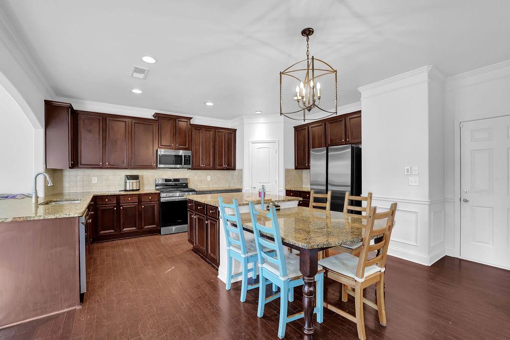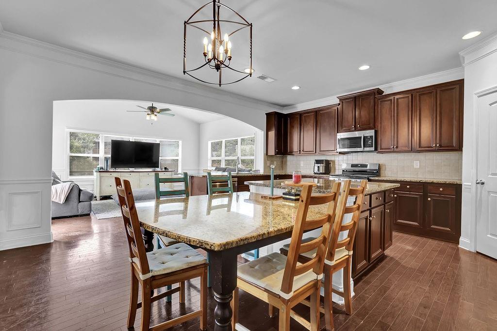 - KitchenCabinets Stain, Eat-in Kitchen, Keeping Room, Kitchen Island, Pantry Walk-In, Stone Counters, View to Family Room