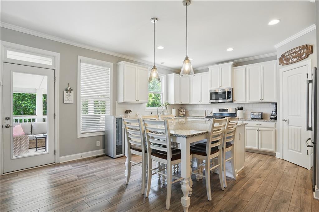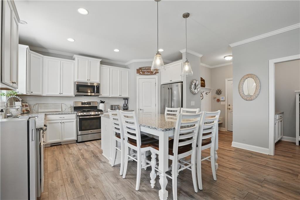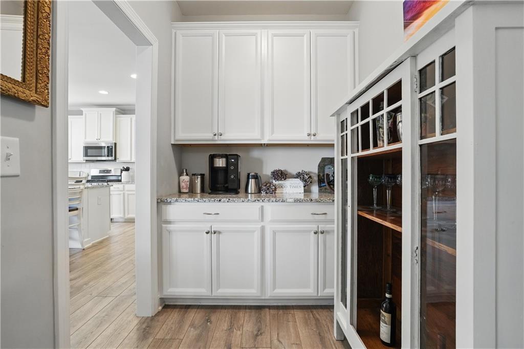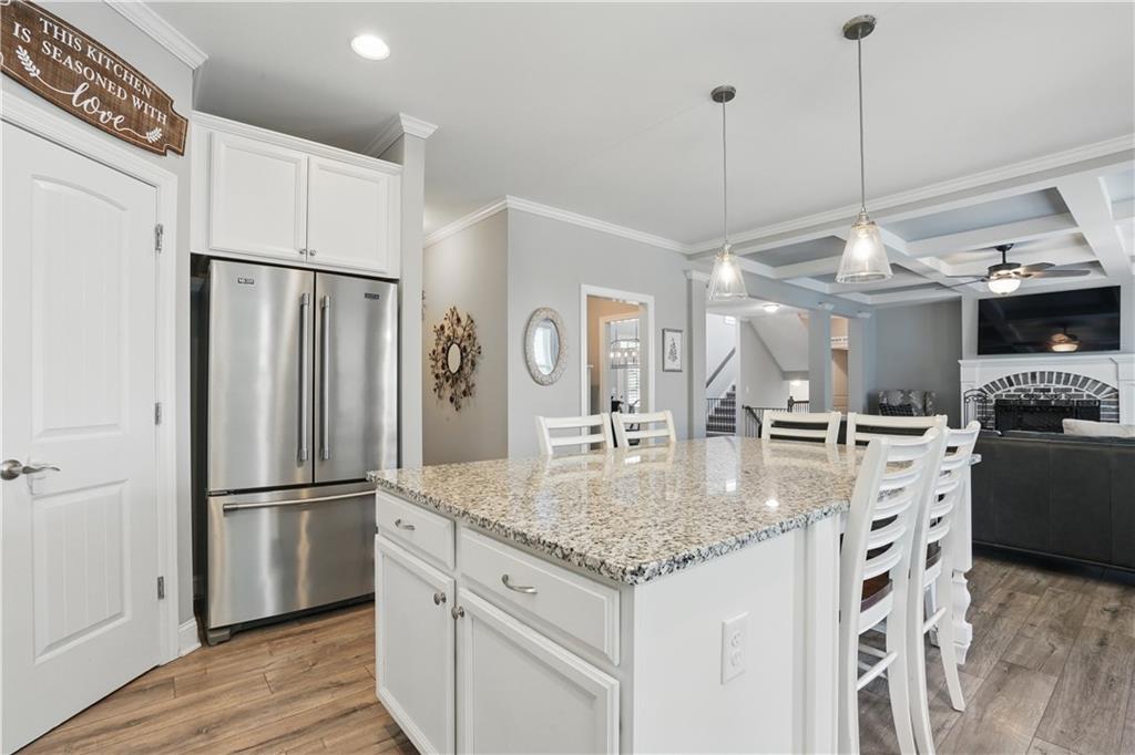 - KitchenBreakfast Bar, Cabinets White, Eat-in Kitchen, Kitchen Island, Pantry, Stone Counters, View to Family Room