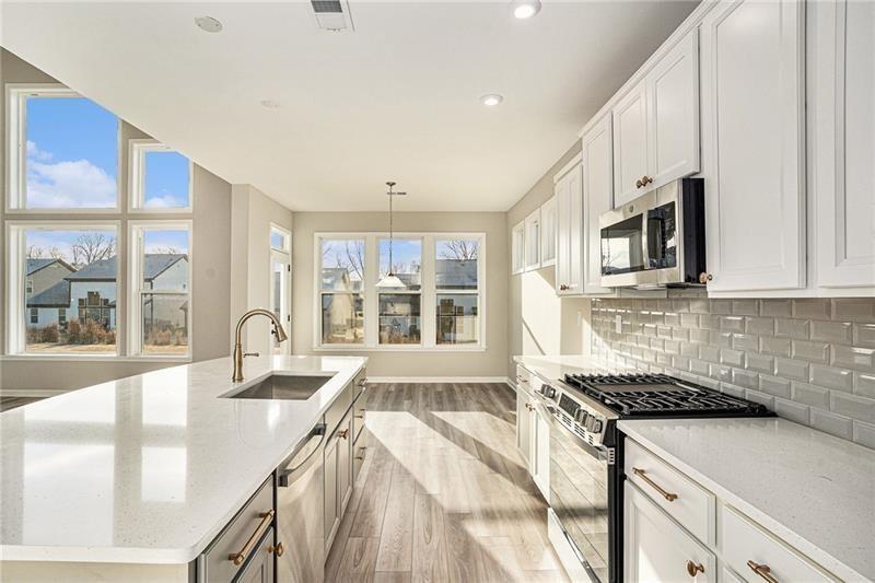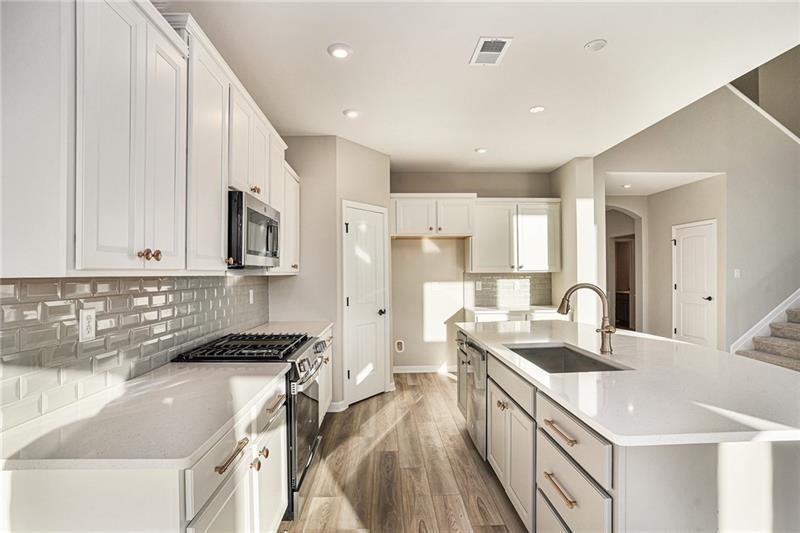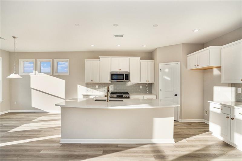 - KitchenCabinets White, Eat-in Kitchen, Kitchen Island, Pantry, Stone Counters, View to Family Room
