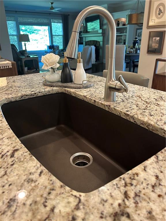 - KitchenBreakfast Bar, Cabinets White, Eat-in Kitchen, Kitchen Island, Other Surface Counters, Pantry Walk-In, Solid Surface Counters, Stone Counters, View to Family Room