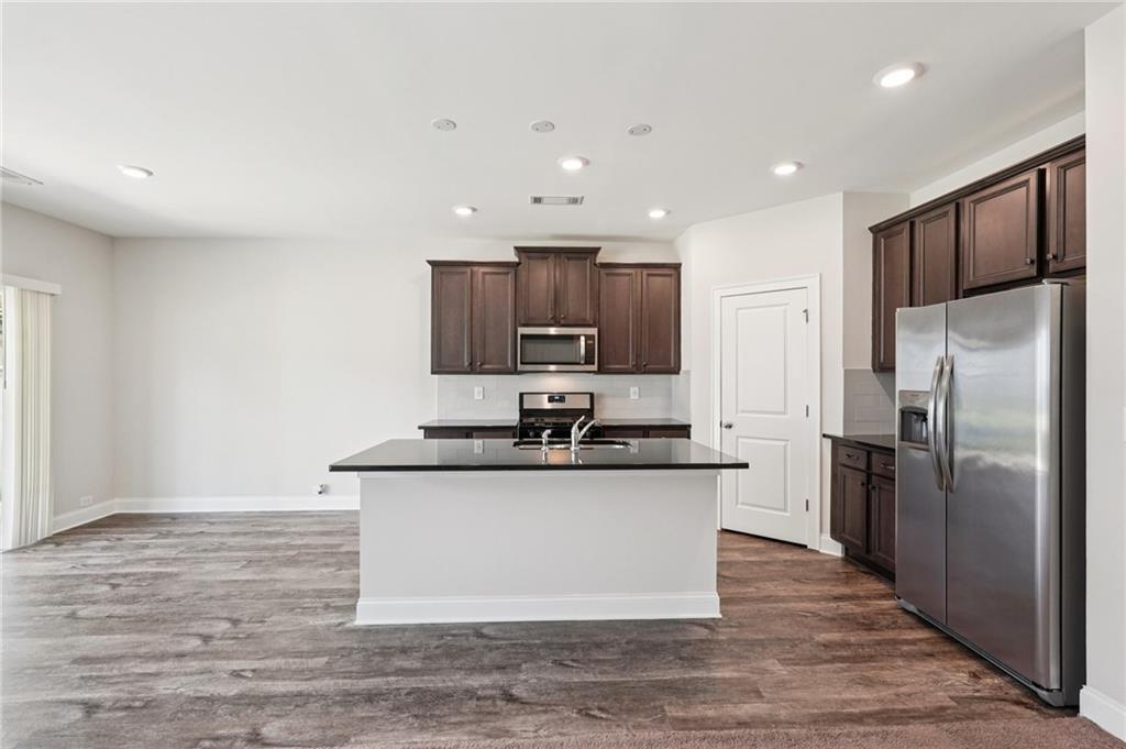 - KitchenBreakfast Bar, Cabinets Stain, Eat-in Kitchen, Kitchen Island, Pantry, Solid Surface Counters, Stone Counters, View to Family Room