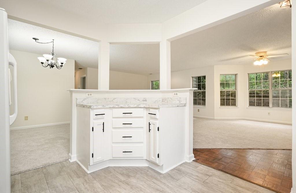 - KitchenCabinets White, Kitchen Island, Laminate Counters, Pantry, View to Family Room