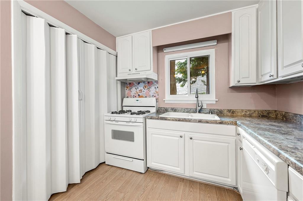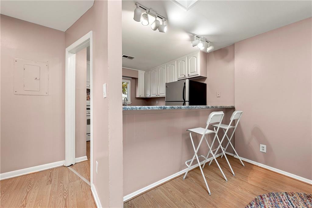 - KitchenBreakfast Bar, Cabinets White, Laminate Counters, Pantry, View to Family Room